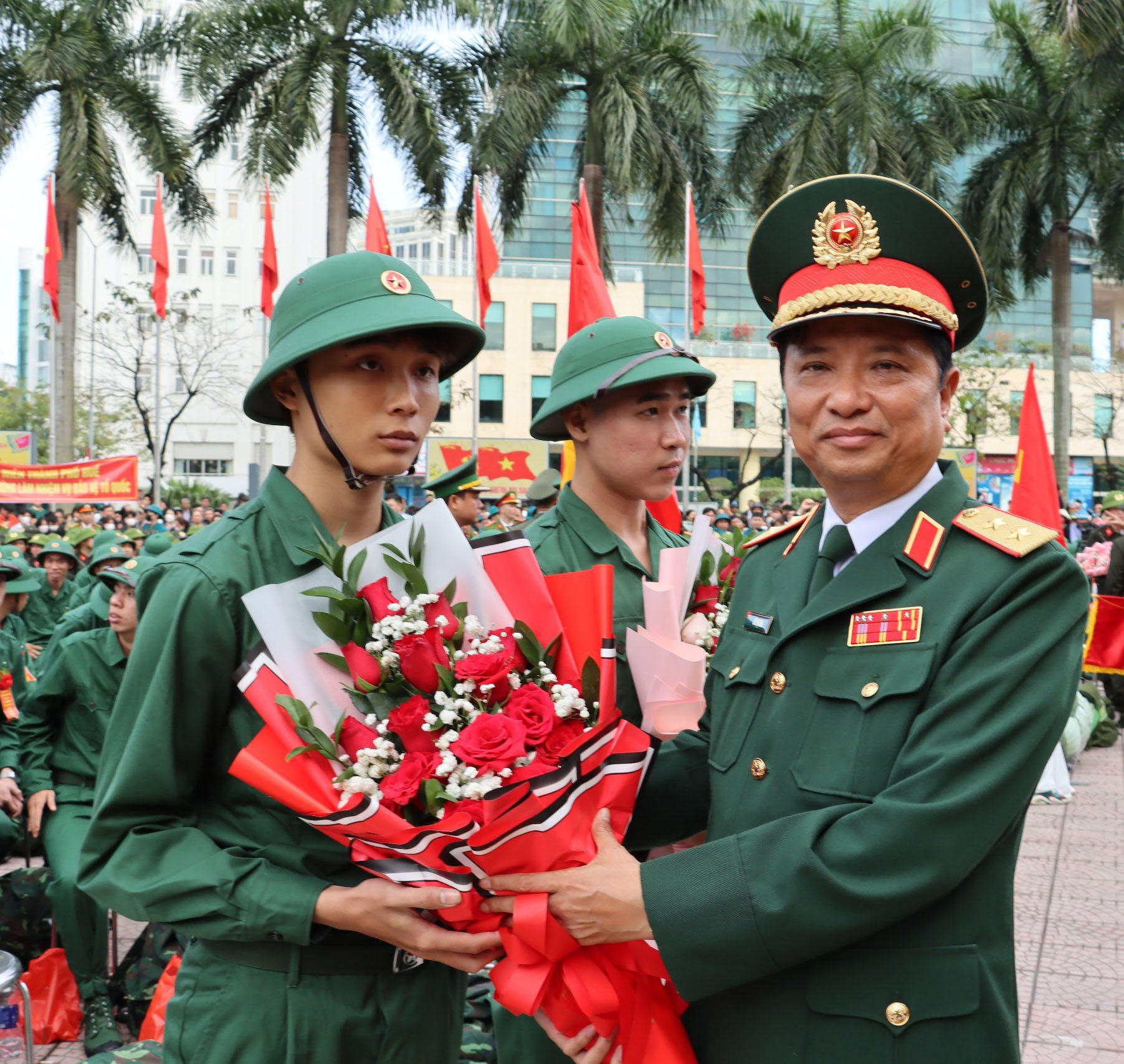 Trung tướng Hà Thọ Bình – Tư lệnh Quân khu tặng hoa chúc mừng các thanh niên Thành phố Huế lên đường nhập ngũ. |
