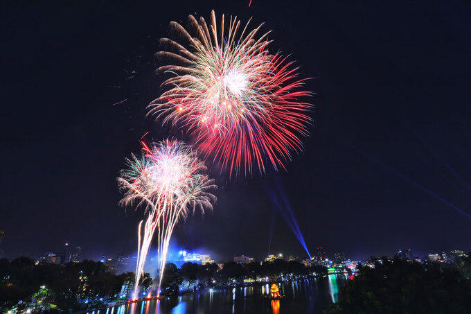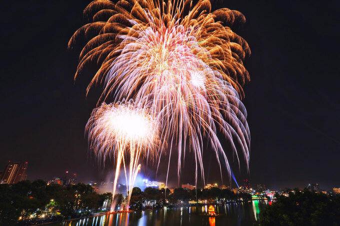 Pháo hoa tung cao giữa trung tâm Thủ đô. Ảnh: VnExpress