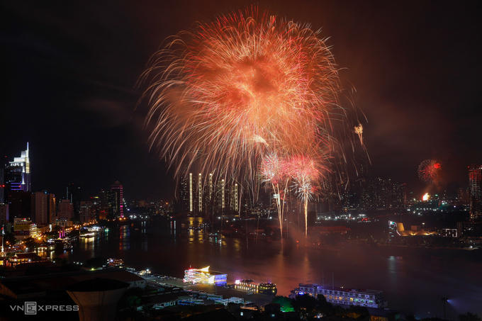 Hoa pháo nở bừng khu vực hầm cầu Thủ Thiêm, TP HCM. Ảnh: VnExpress.