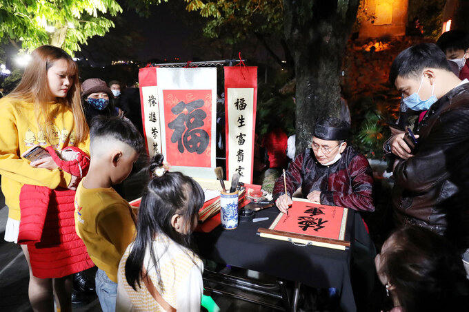 Người dân Hà Nội xin chữ ông đồ những thời khắc đầu năm mới 2021. Ảnh: VnExpress.