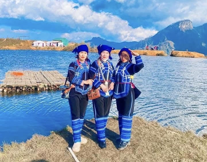 Phụ nữ dân tộc Hà Nhì mặc trang phục truyền thống chụp ảnh bên hồ nước. |