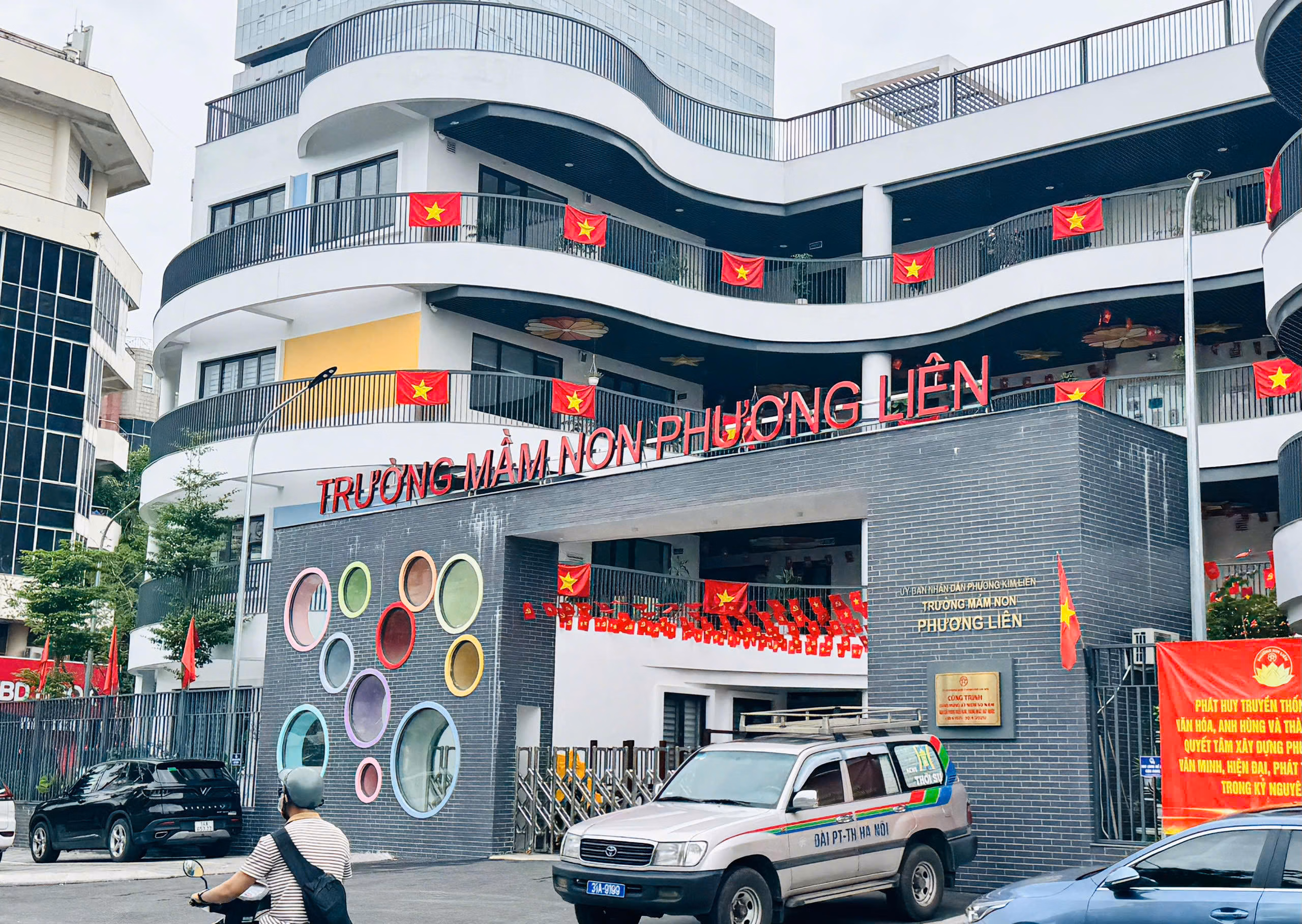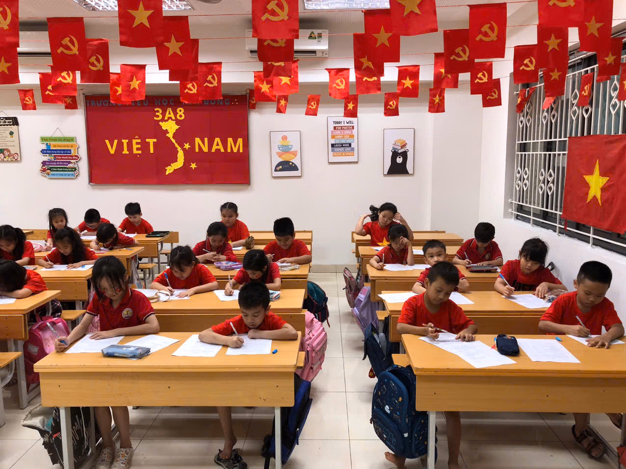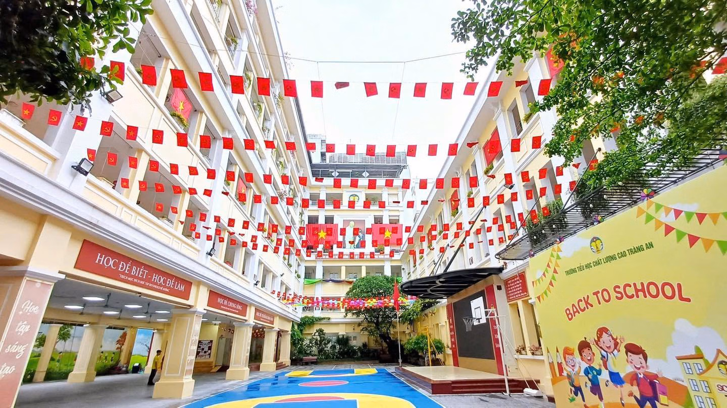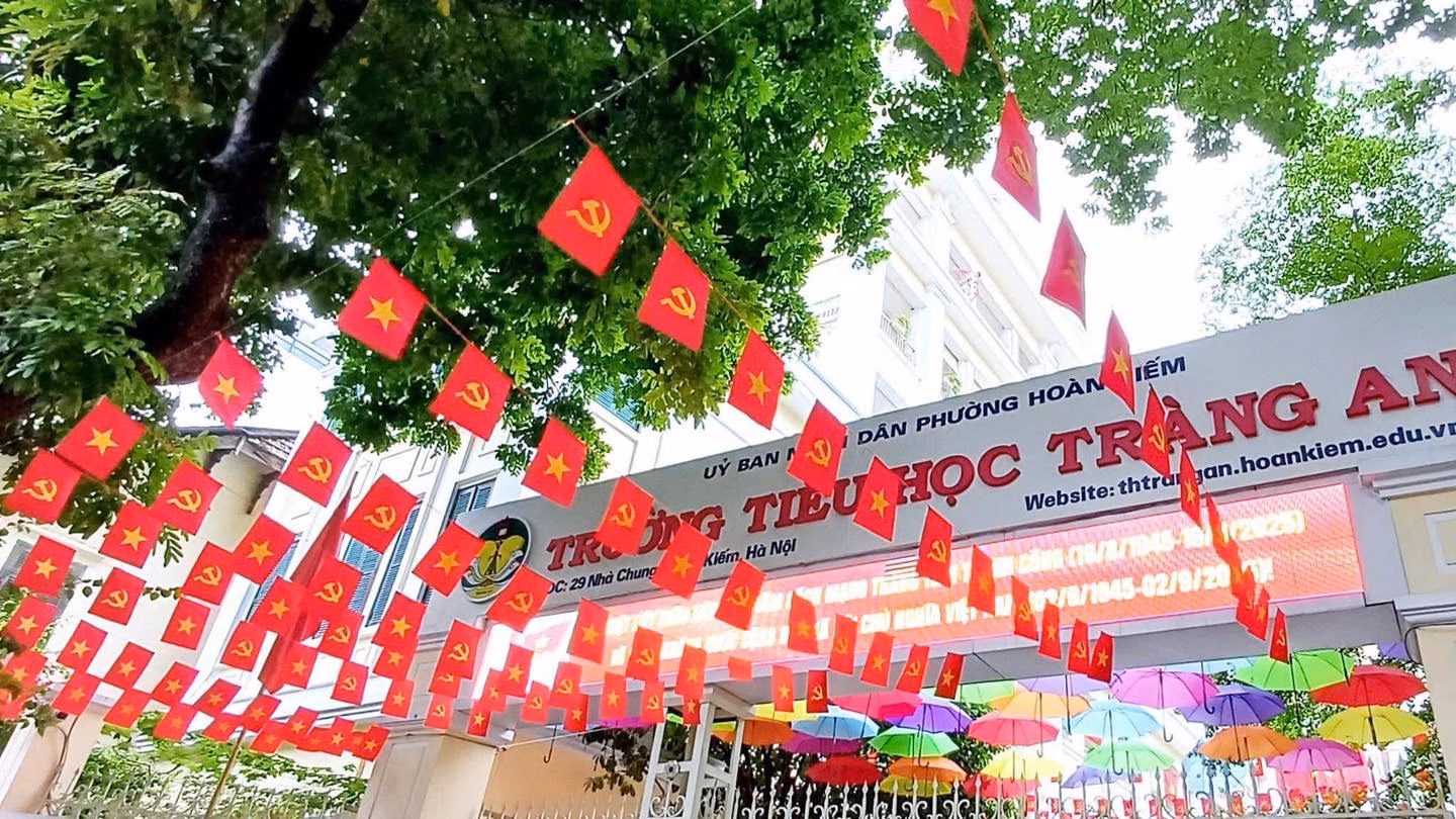 Tại Hà Nội những ngày này, nhiều trường học khoác lên mình tấm “áo mới” rực rỡ với cờ Tổ quốc tung bay, pano, khẩu hiệu bắt mắt. Không gian lớp học, sân trường được bày trí sinh động, góp phần tạo không khí phấn khởi, khơi dậy tinh thần yêu nước trong học sinh.