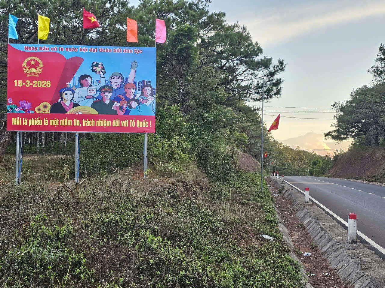 Về vùng đất “phên dậu” phía Tây của tỉnh Lâm Đồng những ngày này khắp các nẻo đường đều ngập tràn cờ Tổ quốc, cờ Đảng, băng rôn, khẩu hiệu. Sắc đỏ của cờ Tổ quốc phủ khắp vùng biên, tạo nên không khí rực rỡ trước ngày bầu cử.