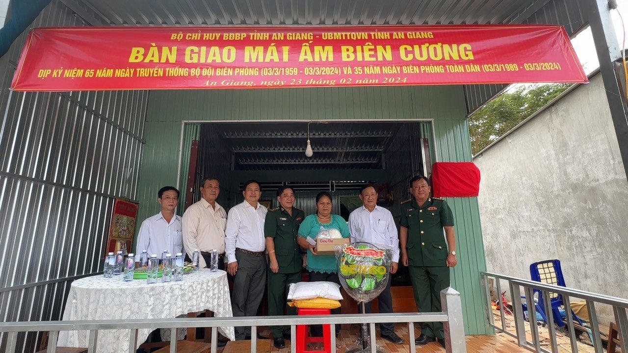Thượng tá Nguyễn Văn Hiệp, Chính ủy BĐBP tỉnh trao nhà “Mái ấm biên cương” cho hộ gia đình ở xã Tân Thạnh, Thị xã Tân Châu. |
