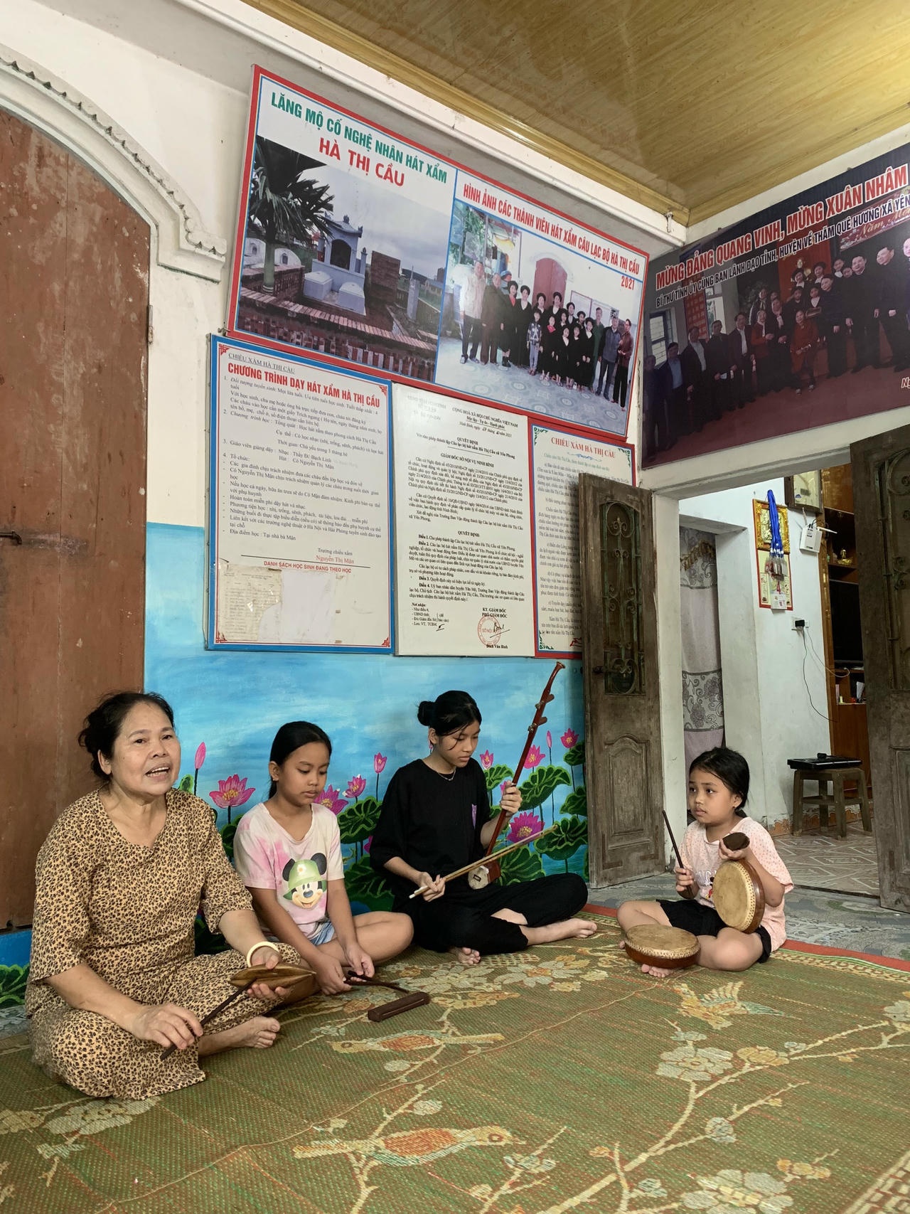 Năm nay 15 tuổi, em Đinh Thùy Linh, chắt ngoại của cụ Hà Thị Cầu được đánh giá có giọng hát tốt và kéo nhị điêu luyện. Linh cho biết: “Em bắt đầu học xẩm theo bà ngoại (bà Mận) từ năm 7 tuổi. Ở đây các em nhỏ cũng đã thuộc đến 30 bài phát triển từ các làn điệu cổ, em và bạn lớn hơn đều thuộc tới 50 - 70 bài hát, làn điệu. Lúc đầu khi mới tiếp cận em thấy chưa quen cách hát sao cho ra xẩm, nhưng sau đó càng học em càng hứng thú và không còn thấy khó nữa”. Bà Mận cho biết, các cháu nội ngoại đều học xẩm rất nhanh. Thùy Linh nay đã cùng bà đứng lớp, không chỉ dạy hát mà còn dạy đàn…