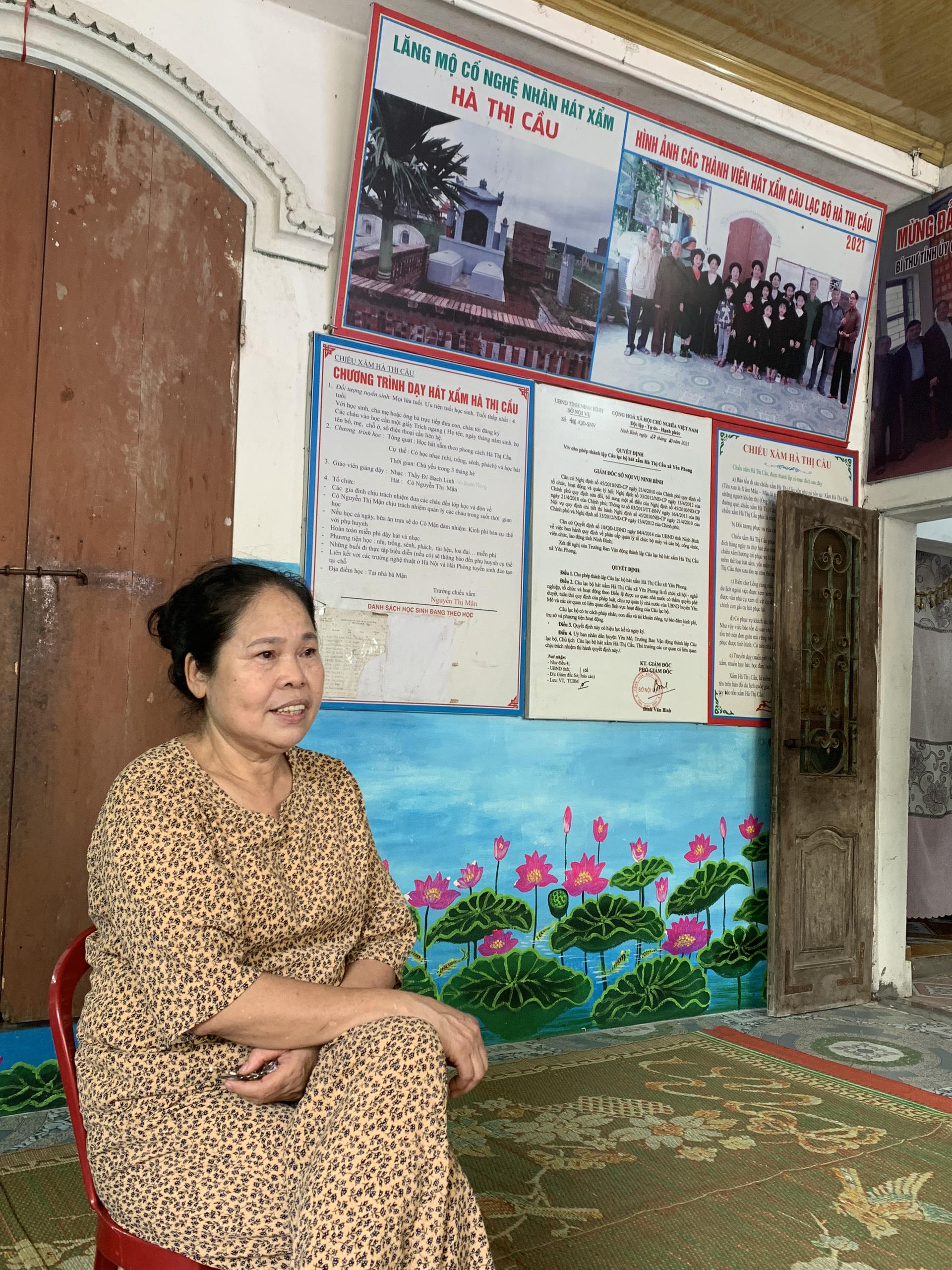Đón chúng tôi trong căn nhà nhỏ nơi nghệ nhân hát Xẩm Hà Thị Cầu từng sống ở làng Quảng Phúc (xã Yên Phong, huyện Yên Mô, tỉnh Ninh Bình) giờ đã là nơi thờ cụ và cũng là không gian sinh hoạt của gia đình bà Nguyễn Thị Mận. Là con gái và cũng là một truyền nhân của cụ Hà Thị Cầu, bà Mận tự hào về câu lạc bộ hát xẩm mang tên cụ Hà Thị Cầu với sự góp sức của bạn bè, chòm xóm để cùng nhau giữ chất xẩm dân gian.