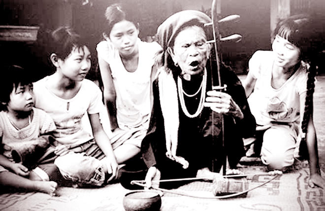 Trẻ em quây quần nghe cụ Hà Thị Cầu hát lúc sinh thời. |