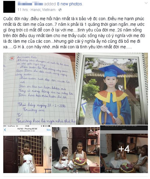 Cuộc đời này, điều mẹ hối hận nhất là không bảo vệ được con. Điều mẹ hạnh phúc nhất là được làm mẹ của con. 7 năm không phải là một quãng thời gian ngắn. Mẹ ước gì ông trời có mắt để con ở lại với mẹ. Tình yêu của đời mẹ. 26 năm sống trên đời điều duy nhất làm cho mẹ thấy cuộc sống này có ý nghĩa đó là được làm mẹ của các con. Nhưng giờ cái ý nghĩa ấy nó cũng bỏ mẹ đi xa. G.H. à, con hãy nhớ! Mãi mãi con là tình yêu lớn nhất đời mẹ. Mãi yêu con - Thiên thần của mẹ!"