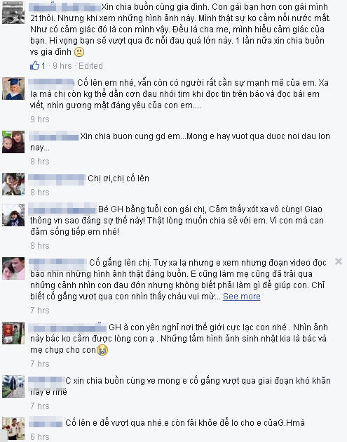 Kèm theo những dòng status đó là chia sẻ của nhiều bạn đọc. "Hãy cố gắng lên chị. Em cũng làm mẹ, cũng đã trải qua những lúc đau đớn khi không biết làm gì để giúp con, chỉ biết cố gắng vượt qua". "Cố lên em nhé, vẫn còn có người rất cần sự mạnh mẽ của em".