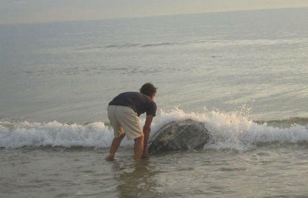 (PLO) - Theo kinh nghiệm của ngư dân địa phương, thì chú rùa biển nặng khoảng 200kg này vào bờ đào cát để đẻ trứng.