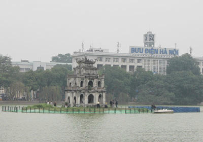 13h hôm nay, rùa Hồ Gươm đâm thủng lưới quây, thoát ra khu vực gần chân Tháp Rùa.