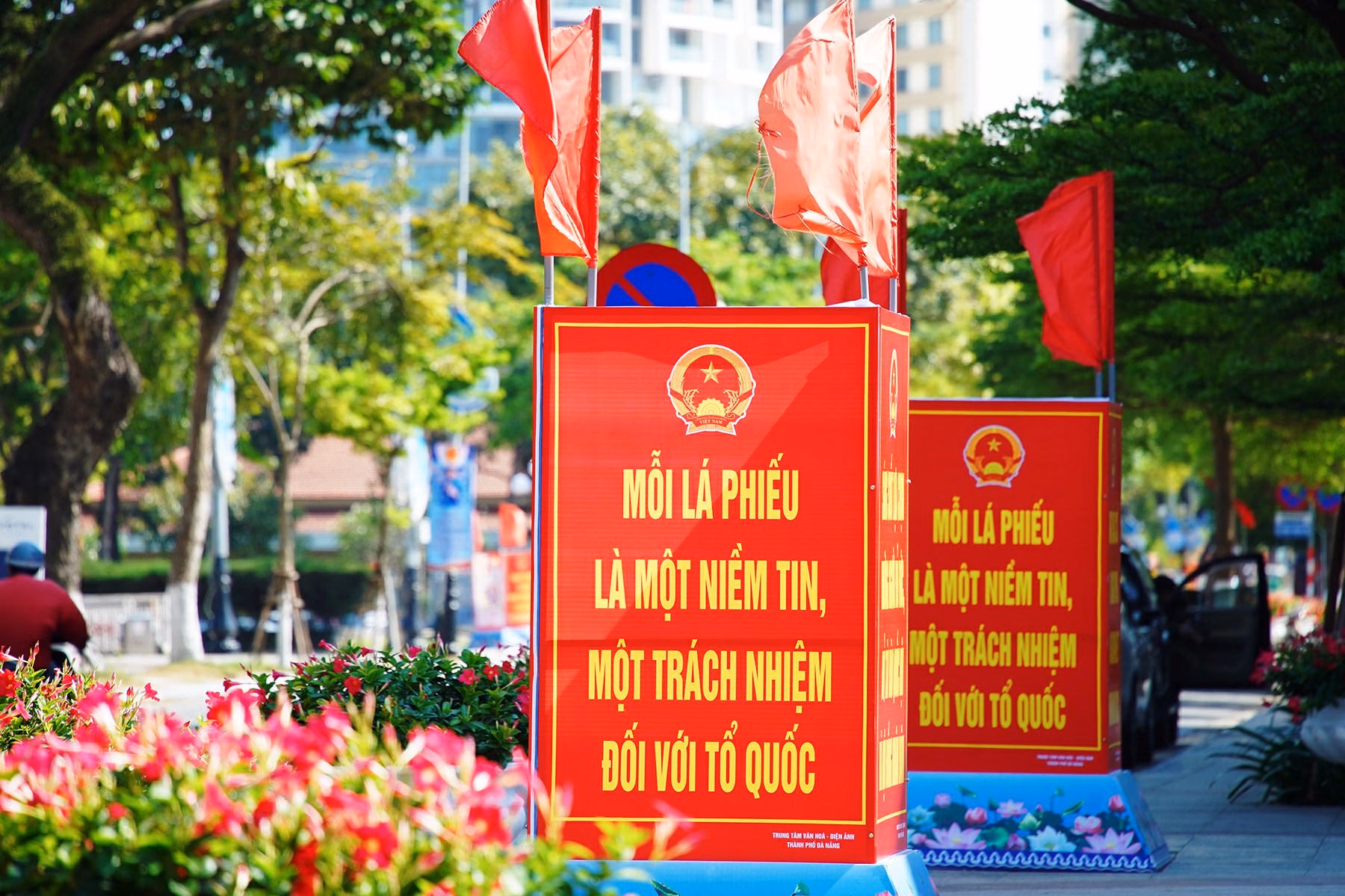 Trong khi đó, tại trung tâm TP Đà Nẵng, nhiều tuyến phố lớn được trang hoàng rực rỡ cờ hoa và các pano tuyên truyền. Không khí chuẩn bị cho ngày bầu cử trở nên sôi động, lan tỏa từ khu dân cư đến các tuyến đường chính của thành phố.
