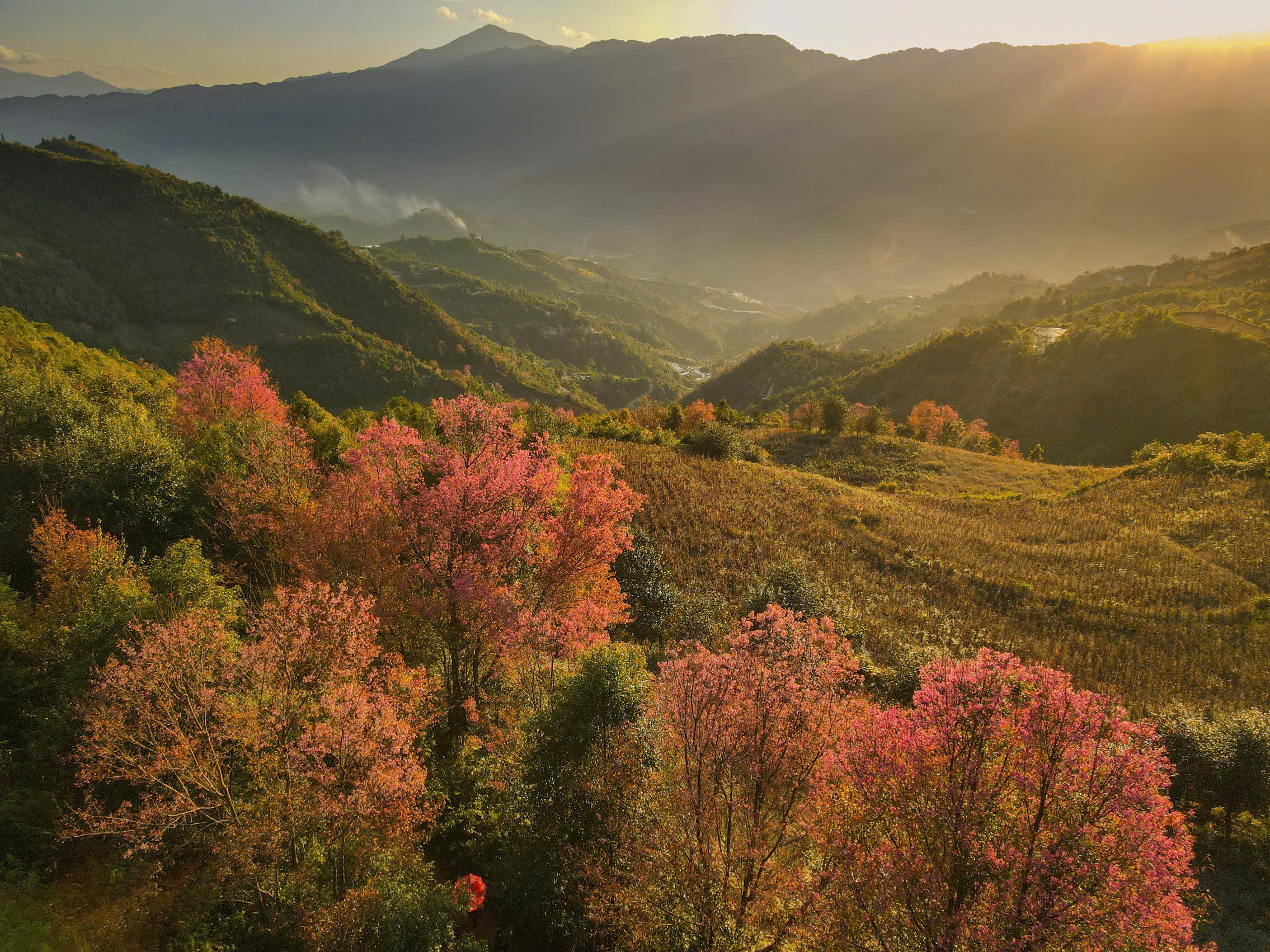 Những ngày cuối tháng 12 - đầu tháng 1 dương lịch, núi đồi ở Mù Cang Chải khoác lên mình sắc hồng rực rỡ của loài hoa Tớ dày. Ảnh: Thào Vàng. |