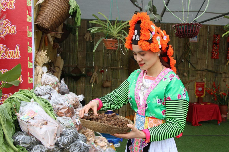 Cô gái dân tộc Mông đang quảng bá nông sản đặc trưng của địa phương.