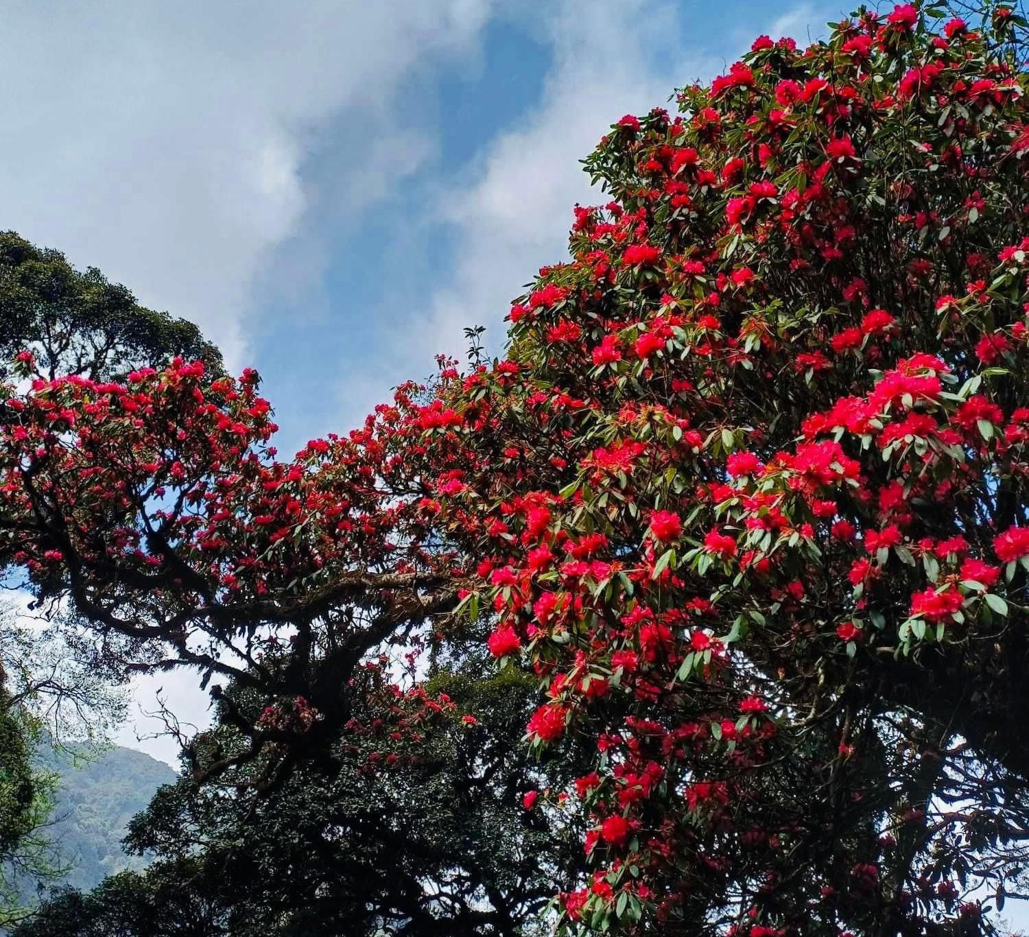 Giữa một vùng rừng núi hùng vĩ, màu sắc rực rỡ của loài hoa đỗ quyên tạo nét chấm phá nổi bật.