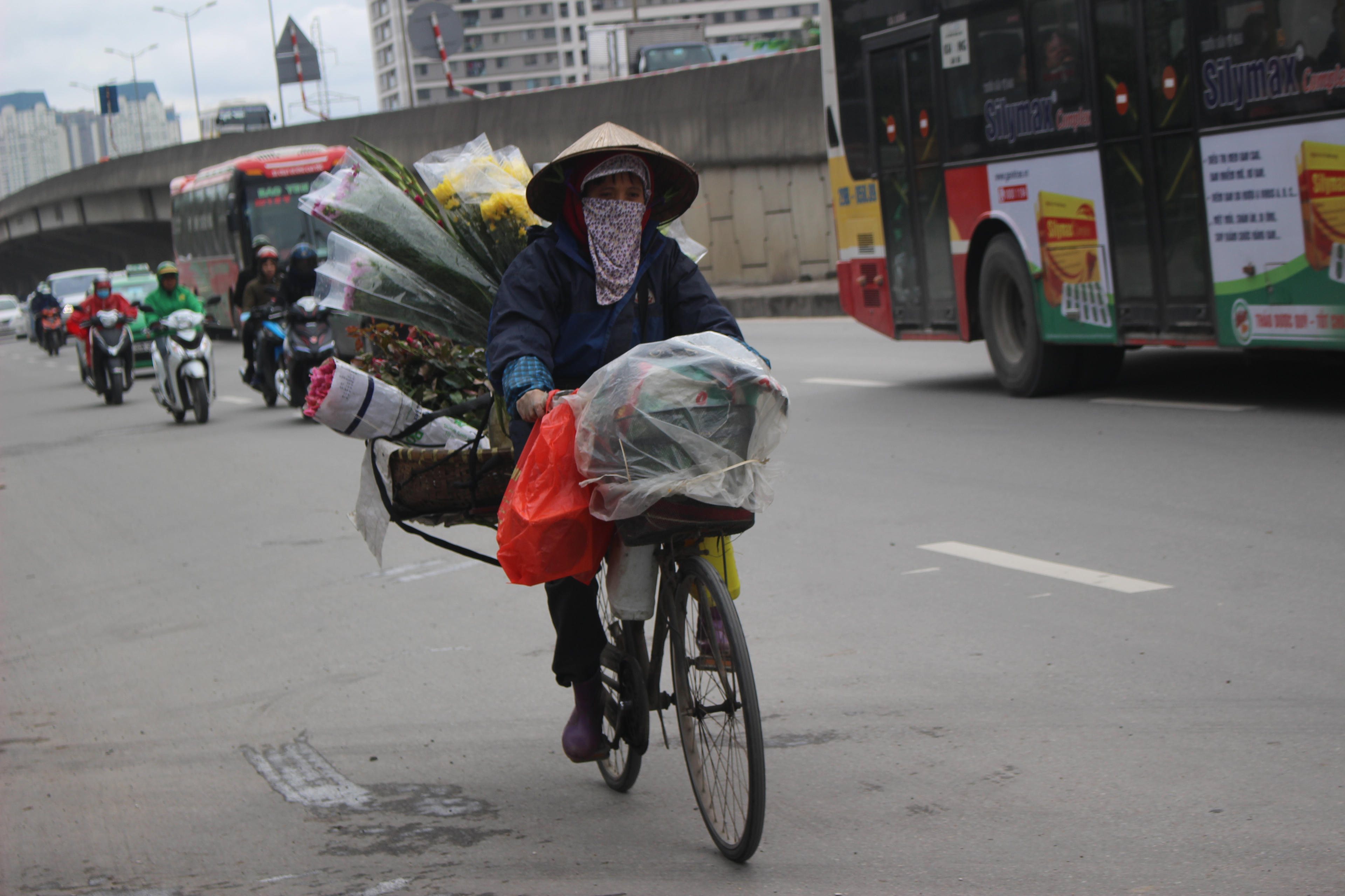 | Cô bán hoa đạp xe từ con phố này sang con phố khác, tay tê cóng, với mong muốn kiếm thêm chút tiền tiêu Tết. |