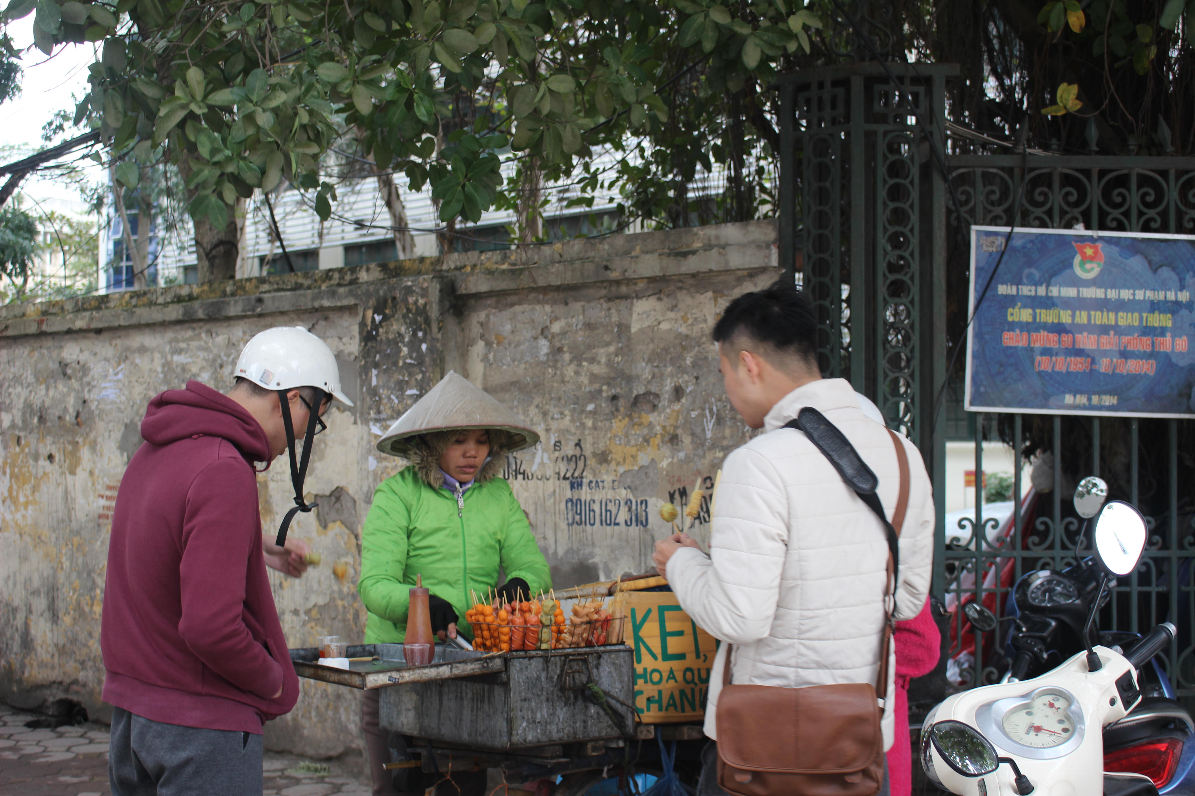 "Chạy" hàng và ấm áp nhất có lẽ là những hàng bán đồ nướng: ngô, khoai, bánh mì, thịt xiên, xúc xích... Trên đường Hà Nội hôm nay không thiếu những hàng quán đốt lửa, vài người chụm đầu, tấm tắc thưởng thức món quà quen thuộc mùa đông.