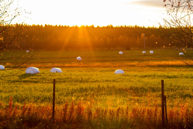 Tiết trời sang thu, những thảm lá chuyển màu cũng là mùa thu hoạch nông sản ở Phần Lan. Cỏ khô được người nông dân đóng thành từng bọc trắng, lưu trữ làm thức ăn cho động vật chăn thả trong mùa lạnh.