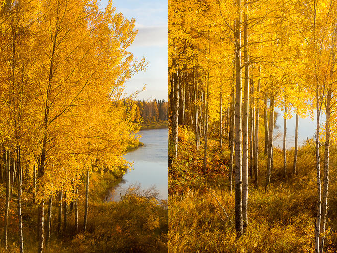 Bên cạnh màu lá vàng, sự đa dạng của cây lá rộng (bạch dương, du, sồi, phong...) và cây lá kim cũng như quả mọng và rêu trên mặt đất tạo nên những mảng màu xanh lá, nâu, xanh lam, đỏ và vàng sống động.