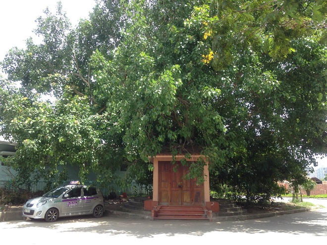 Bà Nguyễn Thị Huyền, thủ nhang đồng đền ở ngôi miếu kể lại: “Cây bồ đề này có ở đây từ lâu lắm rồi, khi bà ngoại tôi hơn 100 tuổi nó đã có. Năm 2003 khu liên hợp thể thao quốc gia chính thức được khởi công, lúc đó cây bồ đề nằm trên đất dự án vì thế nên họ muốn nhổ bỏ đi. Nhưng vì sau đấy gặp phải nhiều biến cố ảnh hưởng đến việc xây dựng nên họ cho cẩu cây đề ra chỗ hiện nay. Mới đầu trước cây đề chỉ là một cái cột nhỏ sơ sài đủ để một bát hương chứ chưa có cái miếu như ngày nay”