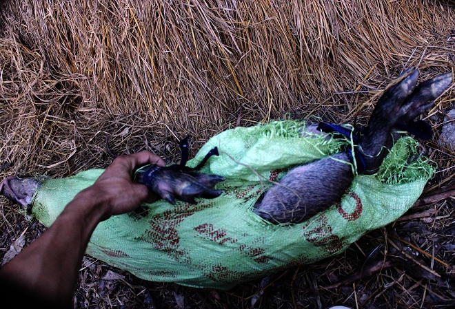 Cố đi một đoạn thì anh gặp ngay một con heo rừng nặng cả tạ mắc bẫy. Nó hục hặc, phóng ánh mắt dữ tợn về phía anh, con heo thủ thế chực tấn công vào người thợ săn: “Hai nanh nó to và dài, nó mới mắc được 2 ngày nên rất hăng”.