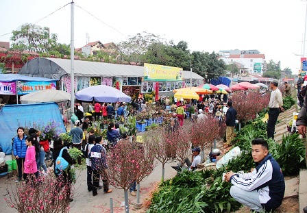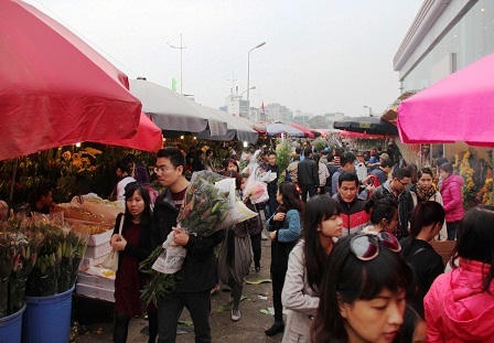 Những bông hoa ly, mai trắng, đào đỏ, hồng, địa lan... khiến người qua đây ngỡ ngàng vì sắc đẹp của chúng. Đoạn đường qua chợ hoa Tây Hồ những ngày gần Tết do đó chật cứng người qua lại, giao thông luôn trong tình trạng quá tải.
