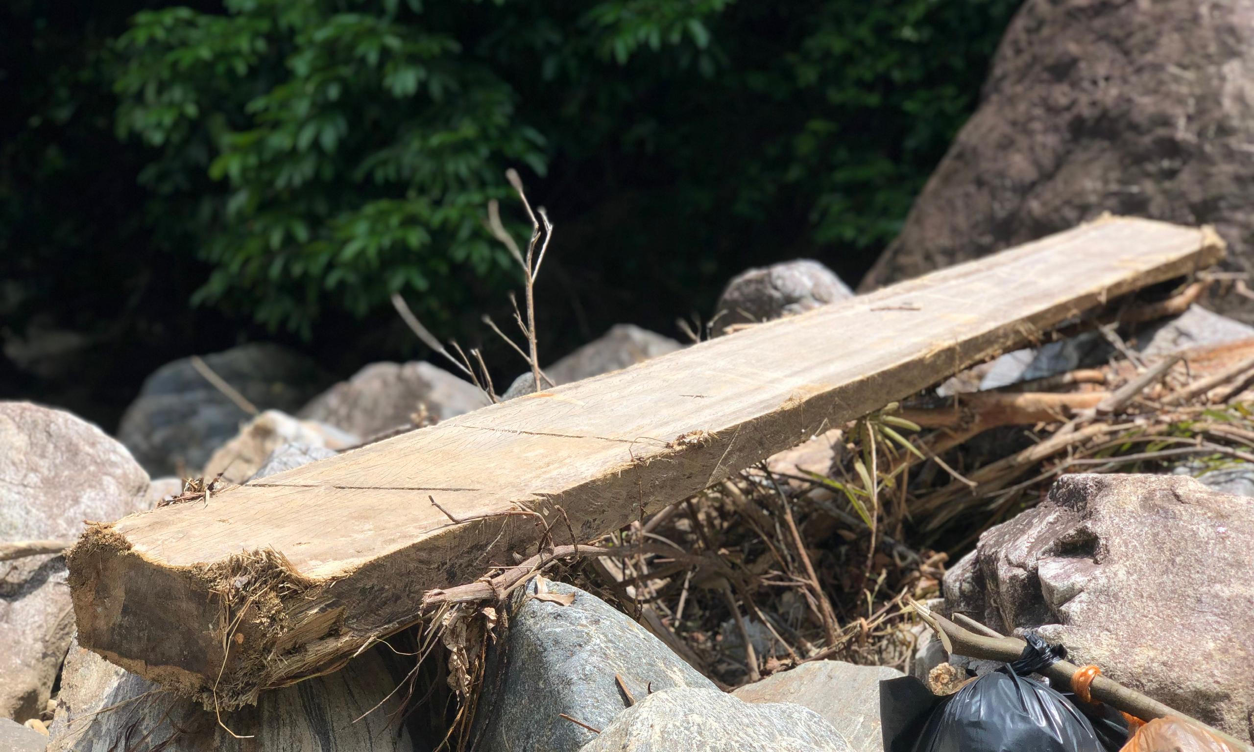 Dọc theo suối, có nhiều phách gỗ bị nước cuốn trôi còn mắc lại nằm trên những tảng đá. |