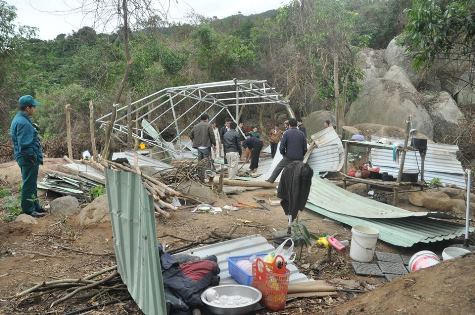Đi sâu vào rừng kiểm tra, lực lượng chức năng tiếp tục phát hiện một lán trại lớn được làm bằng tôn để các công nhân được thuê ở và tiến hành cho phá dỡ lán.