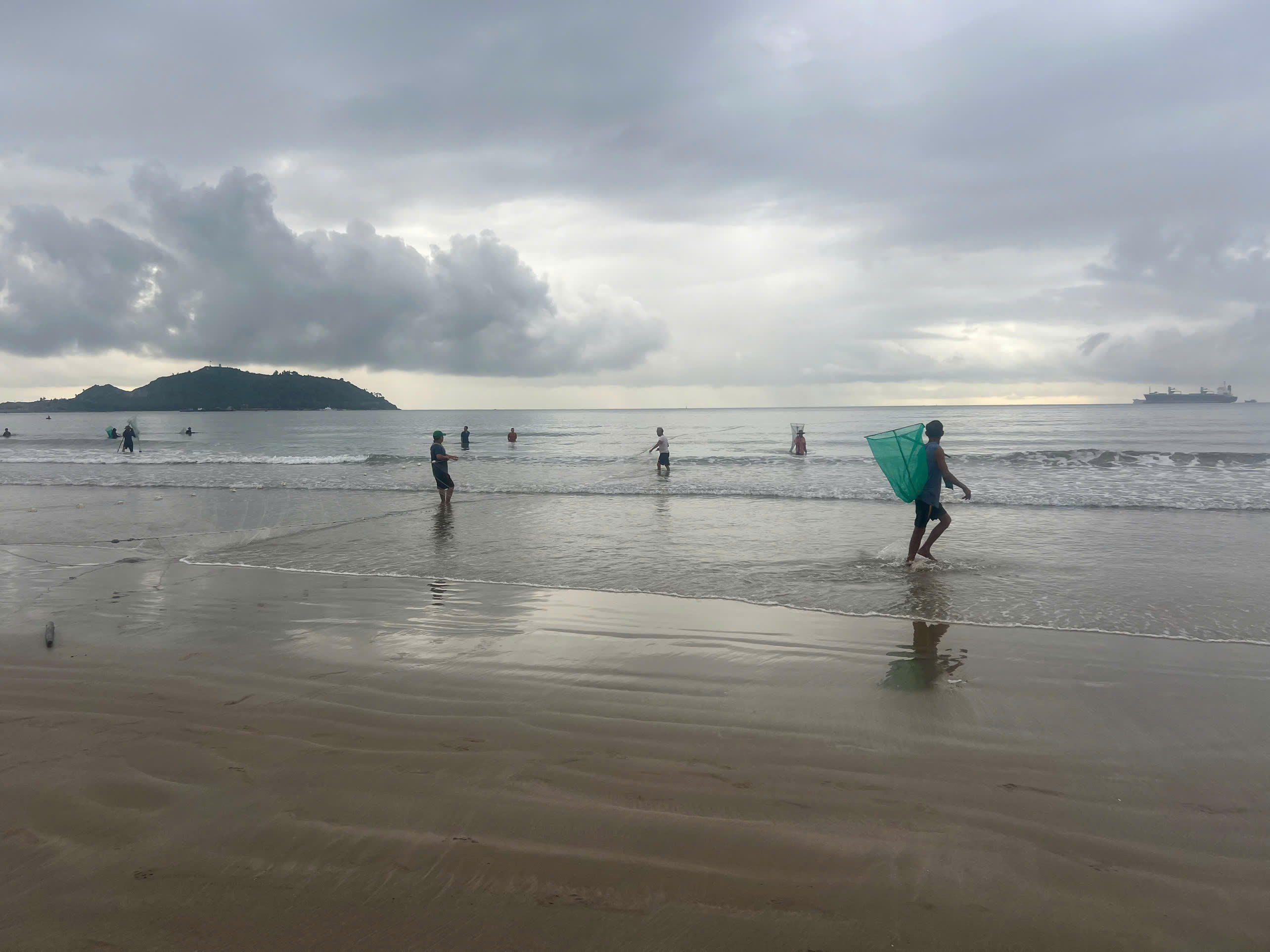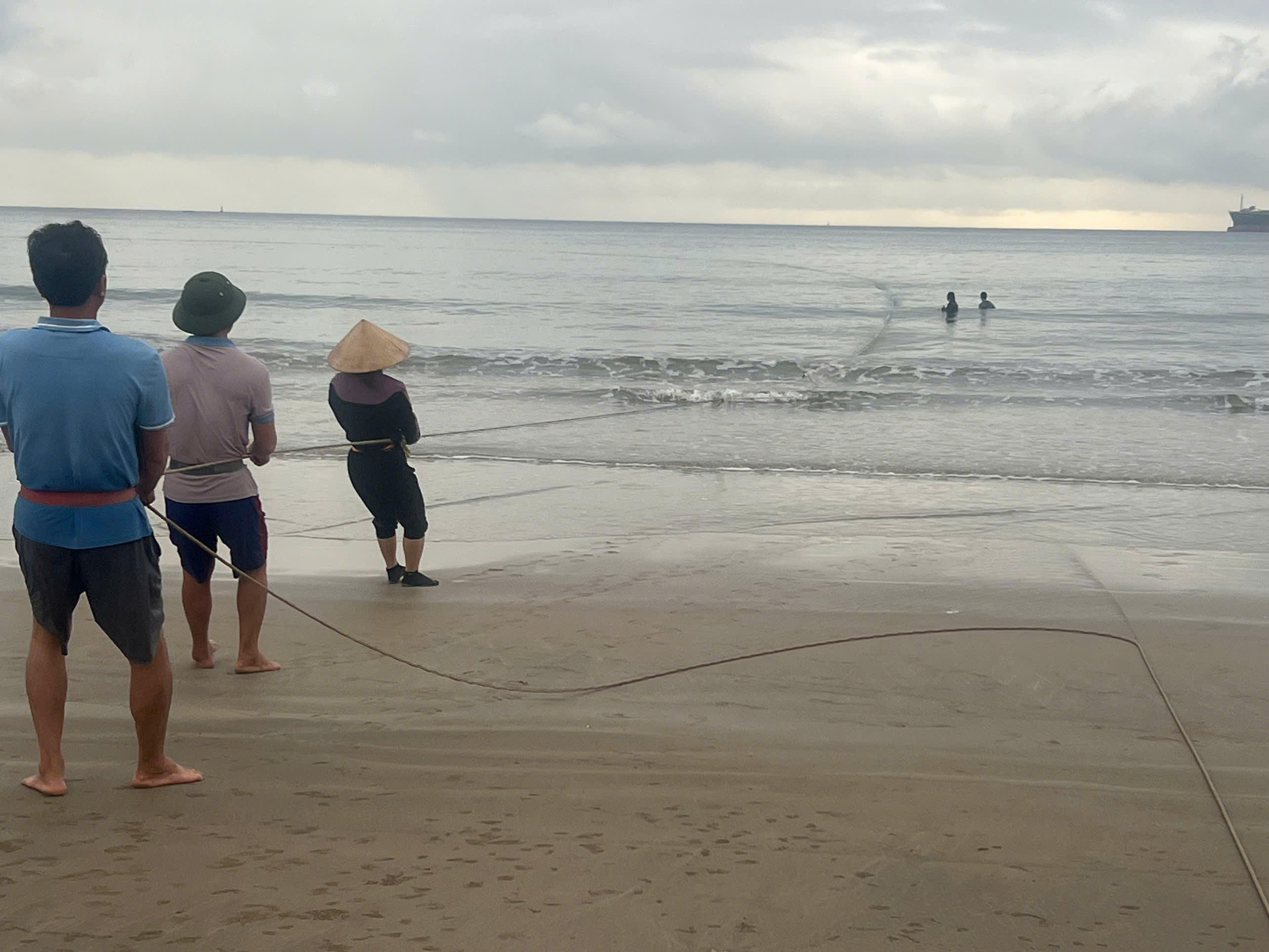 Để hành nghề, ngư dân ở đây kết lưới dài khoảng 200m, cao hơn 6m rồi chèo thúng đưa ra biển cách bờ khoảng 500m để thả. Sau đó mỗi bên huy động khoảng 10 người cùng nhau đi lùi kéo lưới vào bờ trong khoảng 45 phút, kéo hết đợt trước lại tiếp tiếp thả lưới giăng đợt sau, lúc mệt thì về nghỉ.