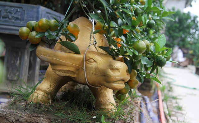 Theo quan sát, có những trâu vàng còn được trang trí trên lưng thảnh thơi đôi chú tiểu đồng rảnh rang thổi sáo hoặc học bài. Bên cạnh trâu, các nhà vườn còn có bình gốm ông thần tài nâng cây quất trên vai…