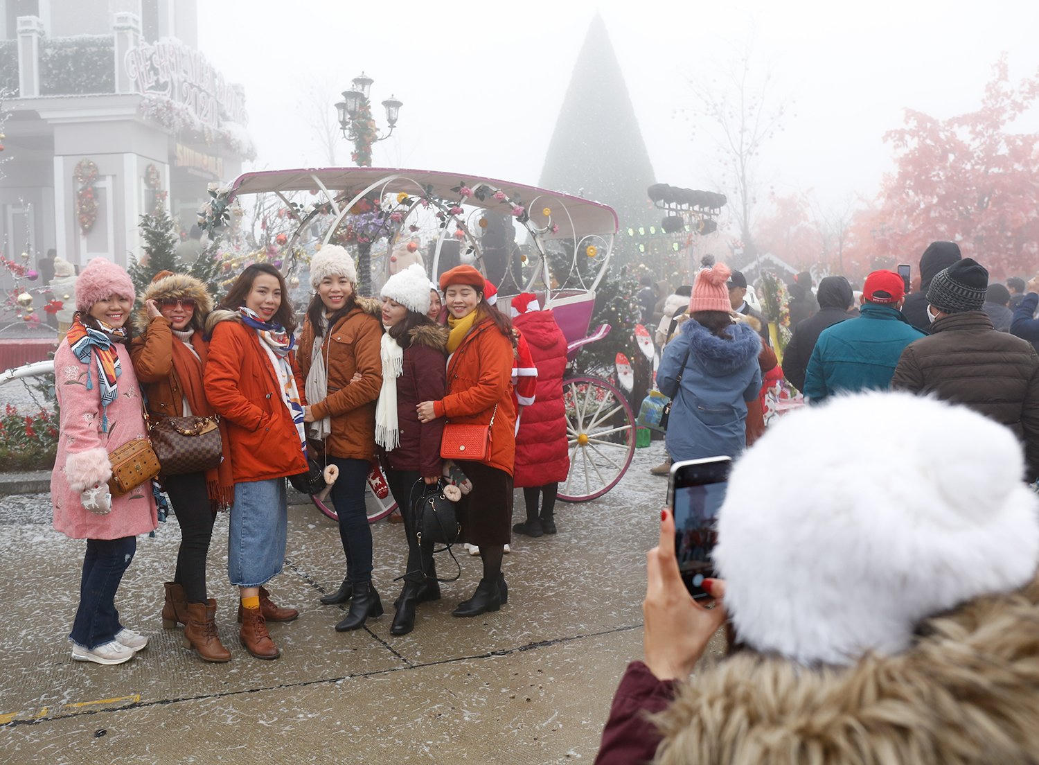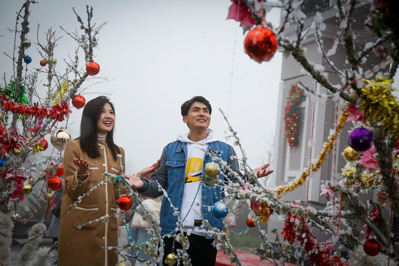 Không gian lễ hội cũng được chăm chút, trang hoàng lộng lẫy với những quả châu óng ánh, các tiểu cảnh mô phỏng mùa đông Bắc Âu siêu dễ thương, con đường lá phong đỏ rực kết hợp với tuyết rơi nhân tạo và sương mù tự nhiên đặc trưng của Sa Pa, làm nên một không gian check-in đặc biệt ấn tượng, thu hút hàng ngàn du khách mỗi ngày.