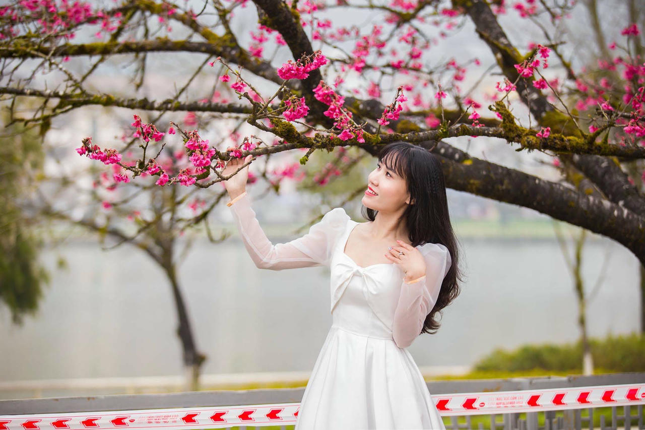 Còn dưới thị xã, điểm “sống ảo” hot nhất là rặng anh đào Nhật Bản đang nở rộ bên bờ hồ trung tâm. Đây là những gốc đào được mang từ Nhật Bản trồng tại thị xã gần 20 năm trước. Cây xoè tán lớn, hoa hồng rực, phủ kín như mây, tạo nên khung cảnh lãng mạn đốn tim mọi du khách.