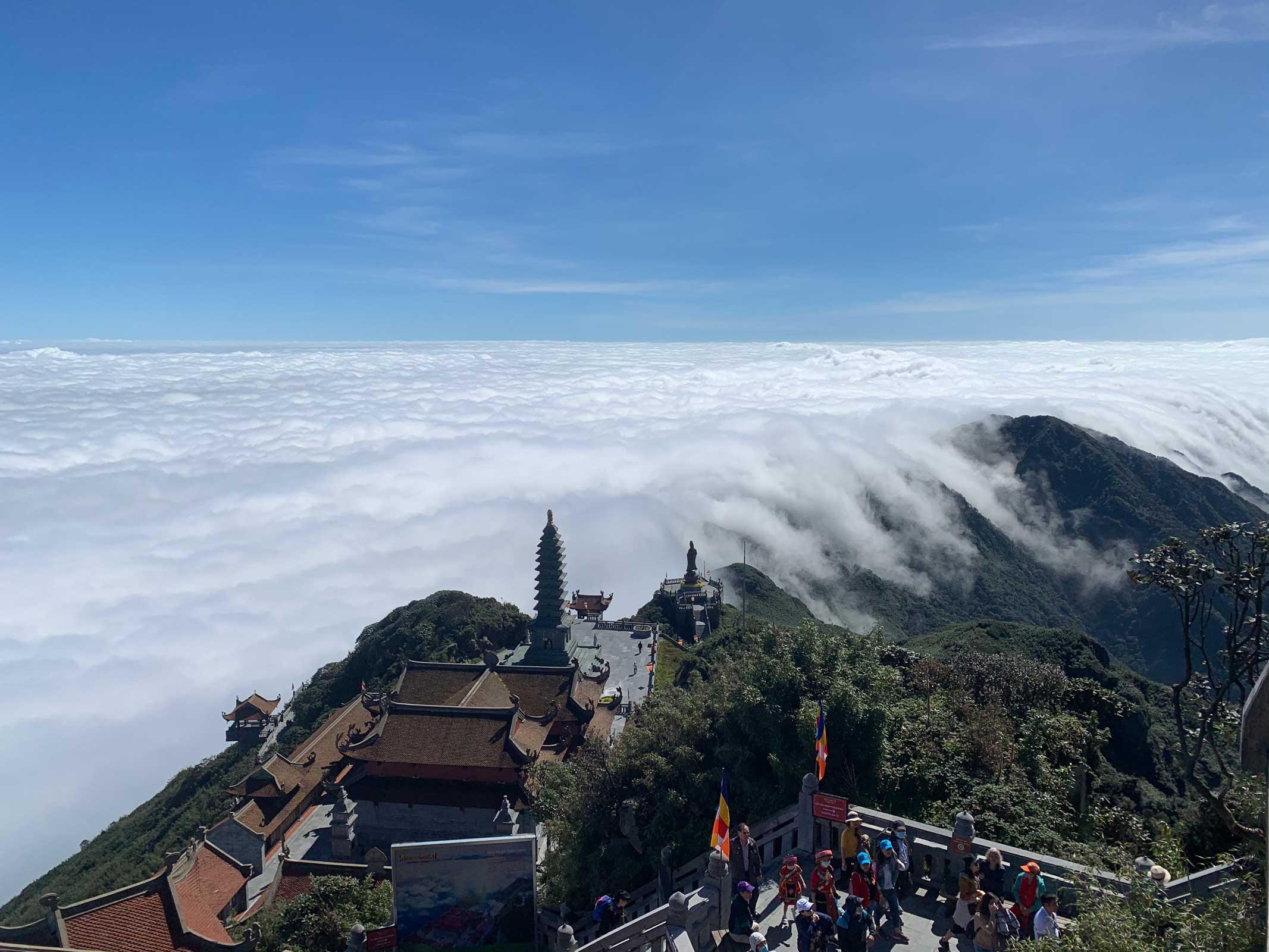 Một lý do nữa khiến khu vực cáp treo nhộn nhịp hơn những điểm đến khác tại Sa Pa là vì thời điểm này đang là mùa săn mây, mùa đẹp nhất trong năm của Sa Pa, và vị trí ngắm mây đỉnh nhất ở nơi đây thì không đâu bằng từ “Nóc nhà Đông Dương”. Đứng trên đỉnh thiêng cao nhất của Tổ quốc, du khách có thể phóng tầm mắt ra khắp bốn phương, thưởng lãm một biển mây trắng bồng bềnh trải dài đến tận chân trời.