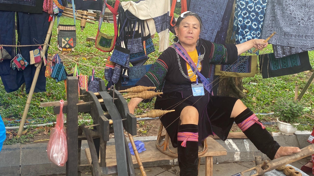 Nghệ nhân người Mông se lanh để dệt những chiếc váy thổ cẩm |