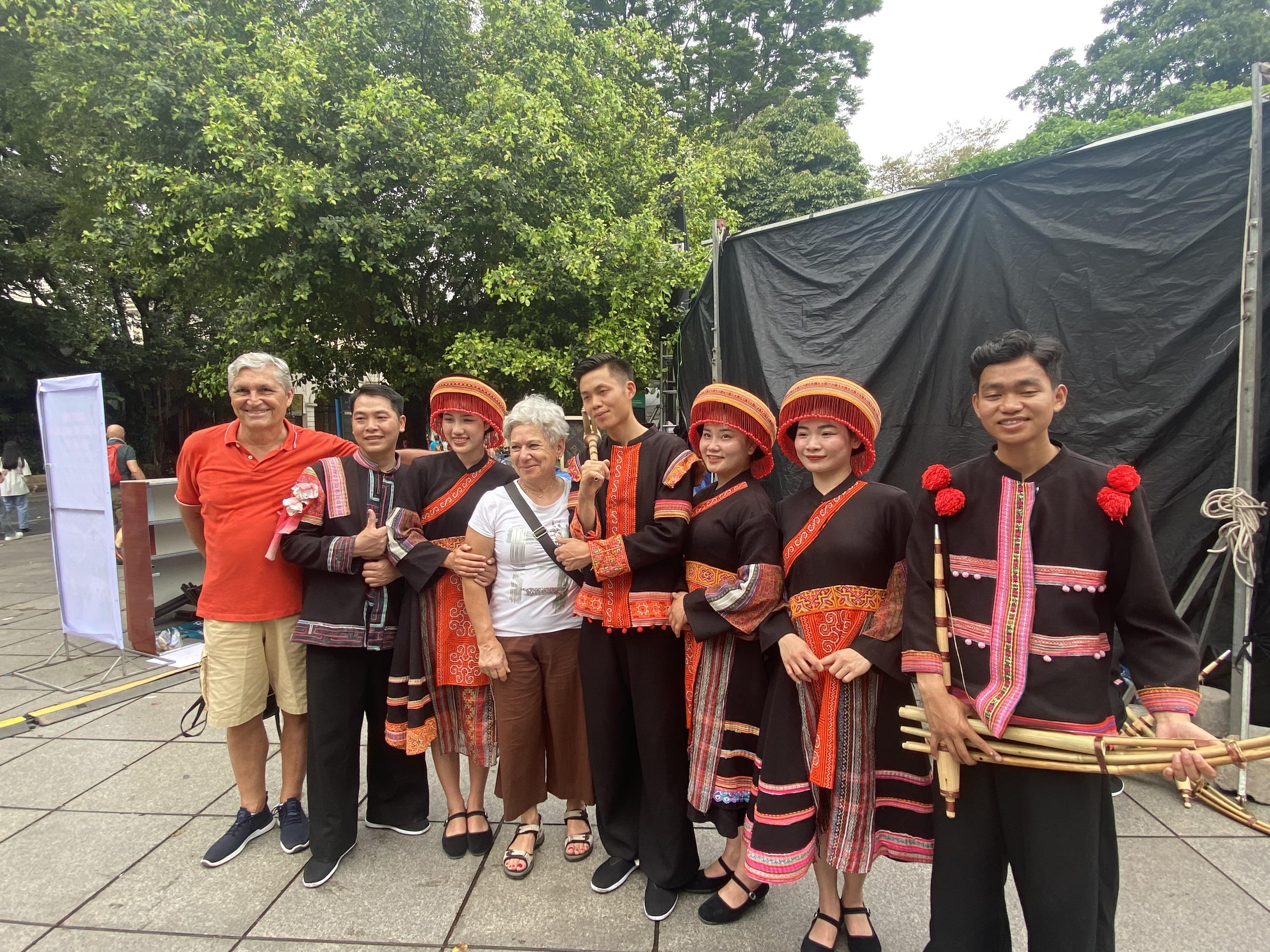 Du khách quốc tế chụp ảnh với đoàn nghệ thuật biểu diễn |