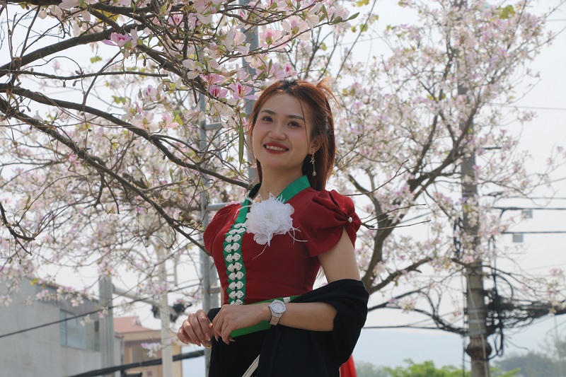 Thiếu nữ dân tộc Thái chụp ảnh bên những hàng ban nở. |