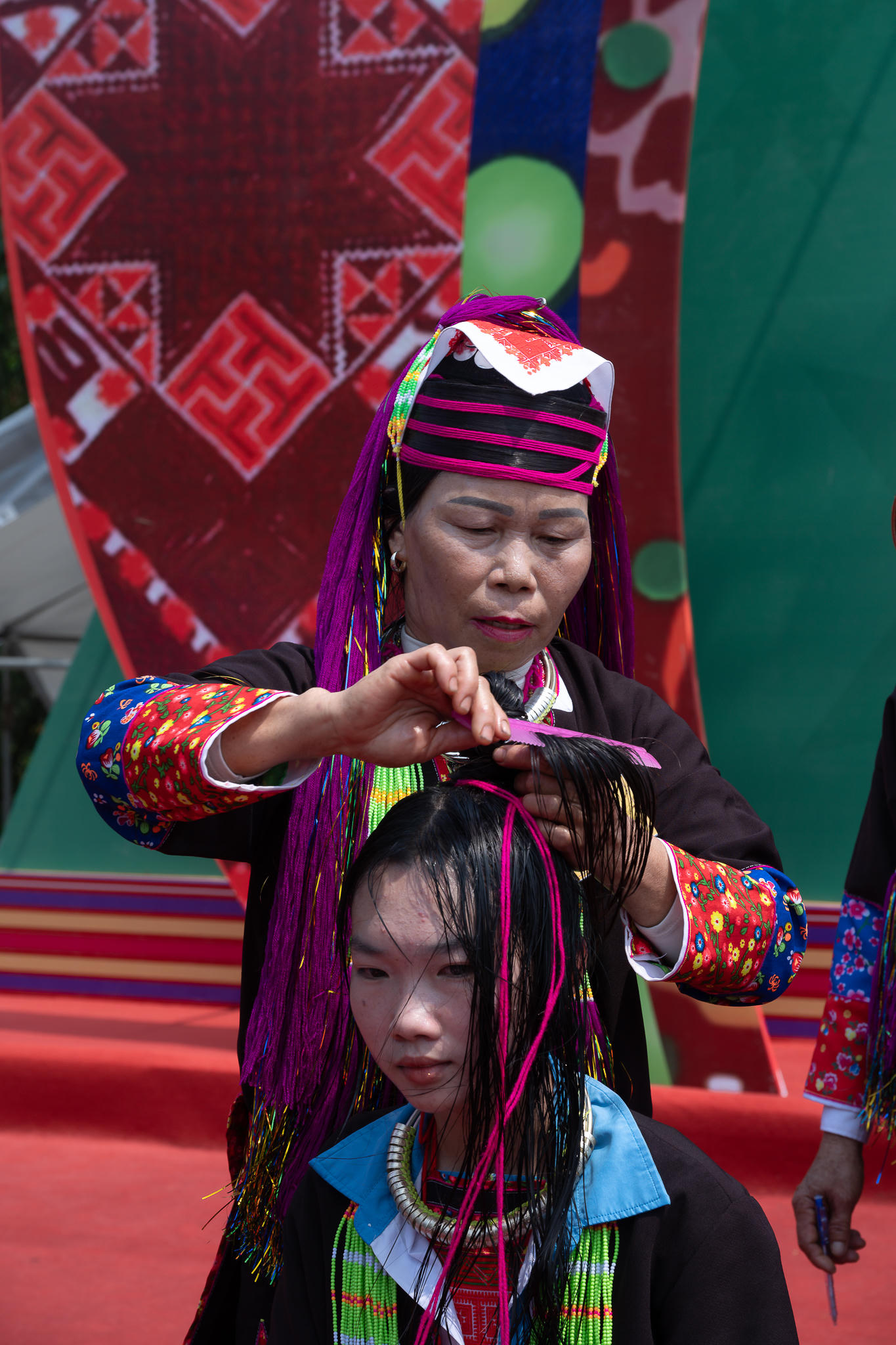 Trong không gian lễ hội, sắc đỏ trở thành gam màu chủ đạo, nổi bật trên nền chàm đen đặc trưng. Những bộ trang phục truyền thống được thêu tay công phu, với hoa văn hình học tinh xảo, tạo nên một “bản giao hưởng thị giác” độc đáo. Phụ nữ Dao Thanh Phán gây ấn tượng bởi trang phục cầu kỳ, mất nhiều tháng, thậm chí nhiều năm để hoàn thiện. Áo dài chàm được điểm xuyết bằng các đường chỉ đỏ, trắng, vàng, tượng trưng cho thiên nhiên và vũ trụ. Trong khi đó, phụ nữ Dao Thanh Y lại nổi bật với sắc đỏ bao trùm gần như toàn bộ trang phục - từ khăn đội đầu, áo đến thắt lưng - thể hiện quan niệm về sự sống, may mắn và xua đuổi tà ma.