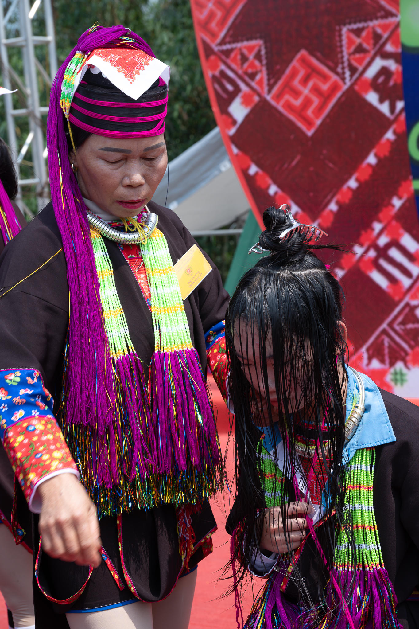 Một trong những điểm nhấn đặc sắc của lễ hội là phần thi vấn tóc - nét đẹp truyền thống không thể thiếu của phụ nữ Dao. Những búi tóc được tạo hình cầu kỳ, kết hợp cùng khăn, vải và trang sức bạc không chỉ thể hiện sự khéo léo mà còn mang ý nghĩa văn hóa sâu sắc, phản ánh địa vị, độ tuổi và quan niệm thẩm mỹ của người phụ nữ.