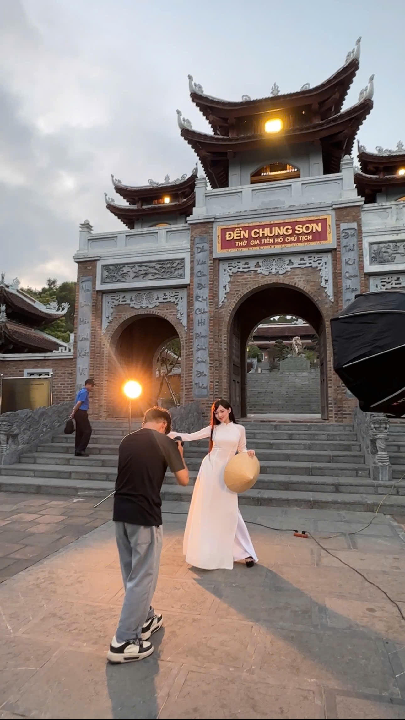 Các bạn trẻ "tác nghiệp" tại Đền Chung Sơn. |