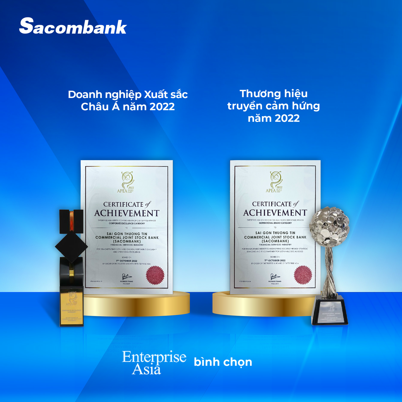Cụ thể, Enterprise Asia bình chọn Sacombank là “Doanh nghiệp Xuất sắc Châu Á năm 2022” (Corporate Excellence 2022) và “Thương hiệu Truyền Cảm hứng năm 2022” (Inspirational Brand 2022) trong khuôn khổ giải thưởng Asia Pacific Enterprise Award (APEA) - được tổ chức thường niên trên 14 quốc gia và thị trường trong khu vực châu Á nhằm vinh danh những doanh nghiệp và nhà lãnh đạo có thành tích nổi bật trong việc xây dựng doanh nghiệp thành công song song với việc tạo ra các giá trị tốt đẹp cho xã hội.