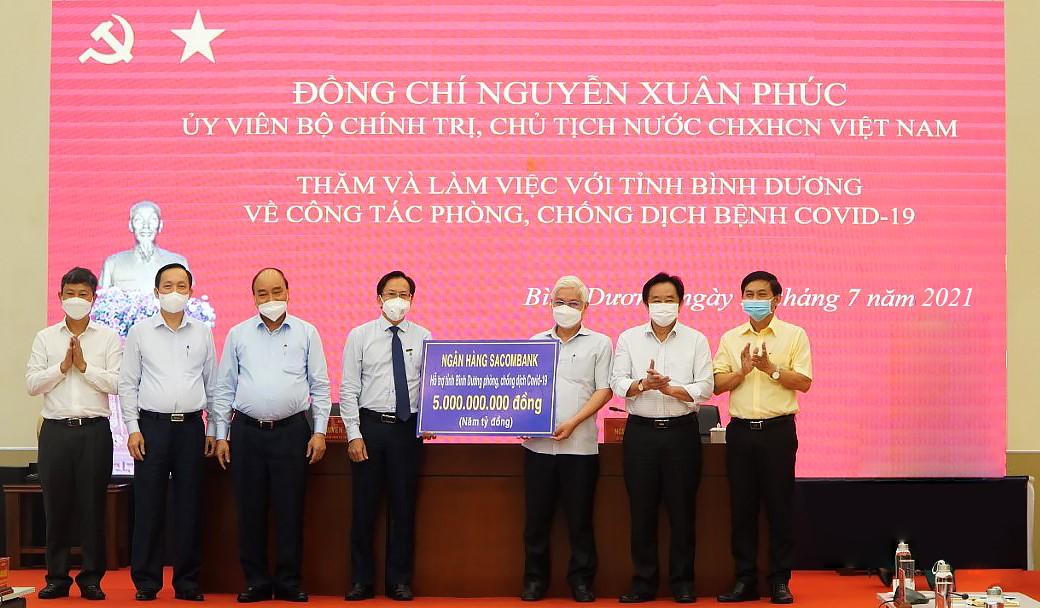 (PLVN) - Trong khuôn khổ chuyến làm việc của Chủ tịch nước Nguyễn Xuân Phúc về thực tế công tác phòng chống dịch COVID-19 tại TP Hồ Chí Minh vào ngày 30/7/2021, Sacombank tiếp tục dành 50 tỷ đồng để đồng hành cùng các địa phương trong công tác phòng, chống và khắc phục ảnh hưởng của đại dịch.