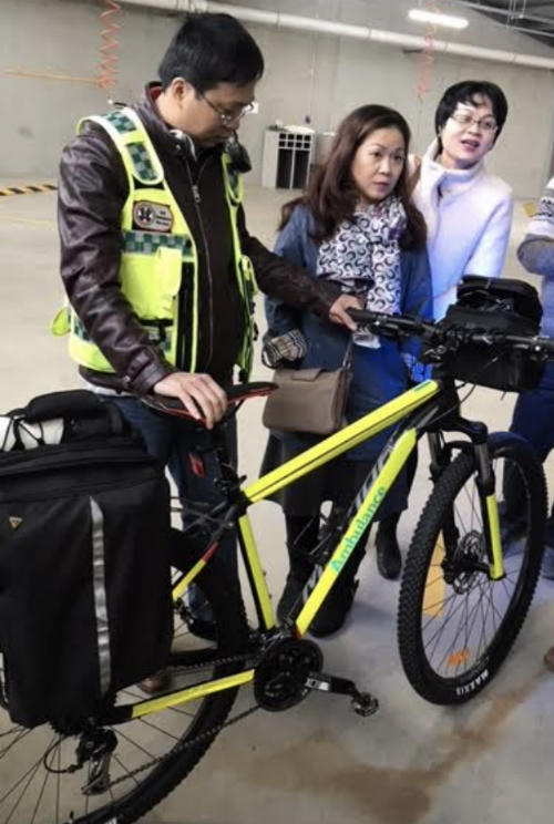 Xe đạpsử dụng trongtình huống giao thông phức tạp màxe cứu thương không tiếp cận được, trang bịđồ dùng không thể thiếu trong cấp cứunhư thuốc, oxy, máy đo huyết áp, máy sốc điện… Ảnh:SYT. |