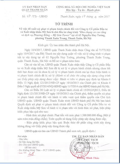 Ông Khổng Minh Thảo – Phó Chủ tịch UBND quận Thanh Xuân vừa ký gửi Văn bản số 47/TTr-UBND về việc đề xuất xử phạt hành chính đối với Công ty Cổ phần Đầu tư và Xuất nhập khẩu Mỹ Sơn là chủ đầu tư công trình “Khu chung cư cao tầng và dịch vụ Phương Đông – Mỹ Sơn Tower” tại số 62 Nguyễn Huy Tưởng, phường Thanh Xuân Trung, quận Thanh Xuân, TP. Hà Nội.