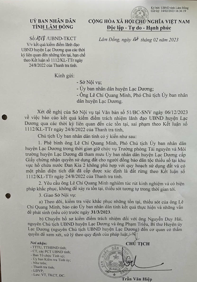 Theo văn bản, Chủ tịch UBND tỉnh phê bình ông Lê Chí Quang Minh, Phó Chủ tịch UBND huyện Lạc Dương trong thời gian giữ chức vụ Trưởng phòng TN&MT huyện đã tham mưu huyện cấp GCN cho người dân tại khu vực hồ chứa nước Đan Kia 2 không phù hợp quy hoạch sử dụng đất (SDĐ) và có một phần diện tích đất đã cấp được xác định là đất rừng. Chủ tịch tỉnh yêu cầu ông Minh nghiêm túc rút kinh nghiệm, có biện pháp khắc phục, không để xảy ra tồn tại, thiếu sót tương tự.