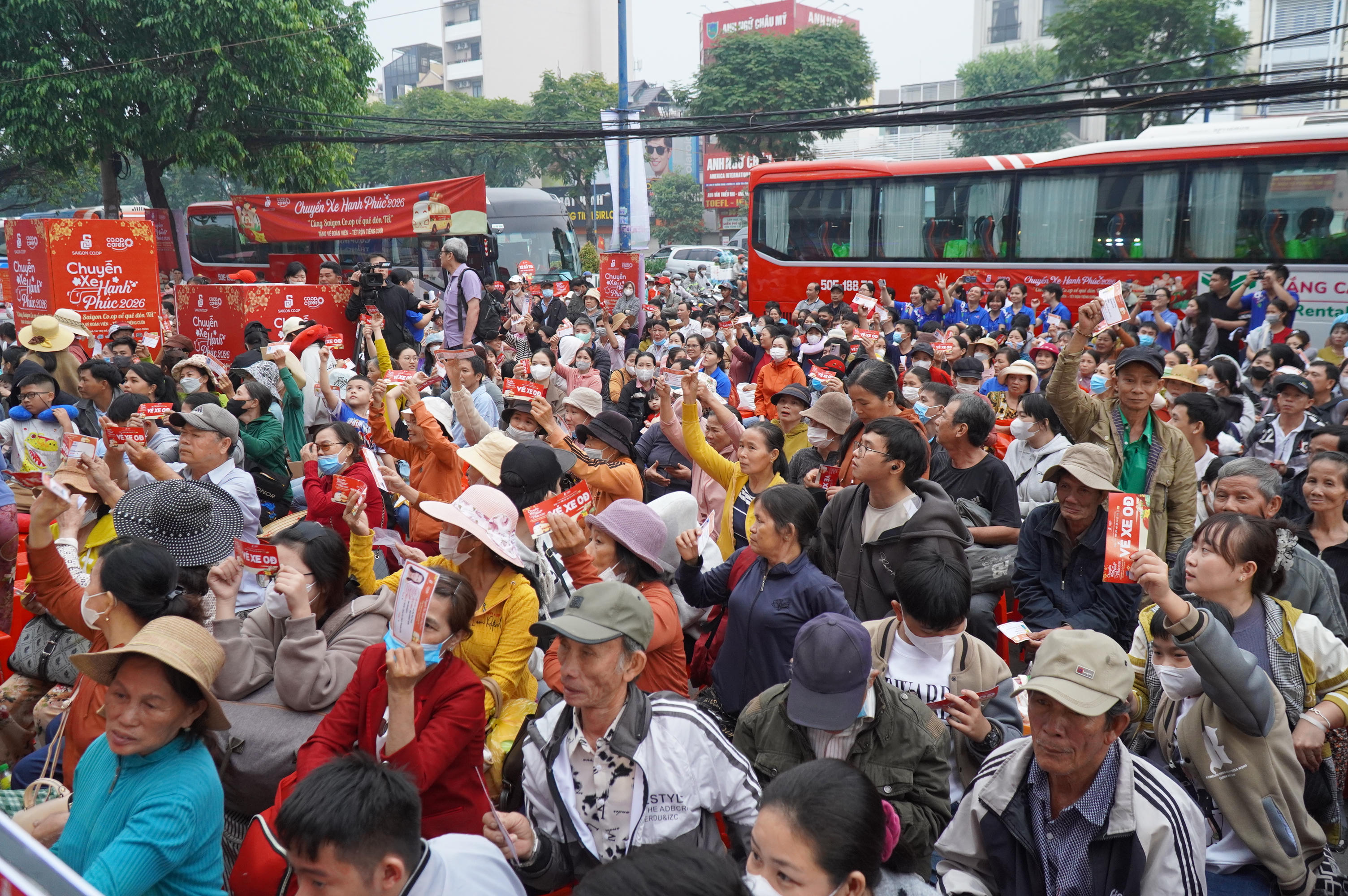 6h sáng ngày 12/2/2026, hơn 900 hành khách đã tập trung tại Co.opmart Thắng Lợi (TP Hồ Chí Minh) để chuẩn bị khởi hành về quê trong chương trình “Chuyến xe hạnh phúc - Cùng Saigon Co.op về quê đón Tết”.