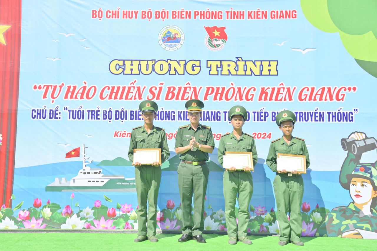 Đại tá Huỳnh Văn Đông, Bí thư Đảng ủy, Chính ủy Bộ đội Biên phòng tỉnh Kiên Giang trao giải nhất, nhì, ba cho các thí sinh tham gia sân chơi. |