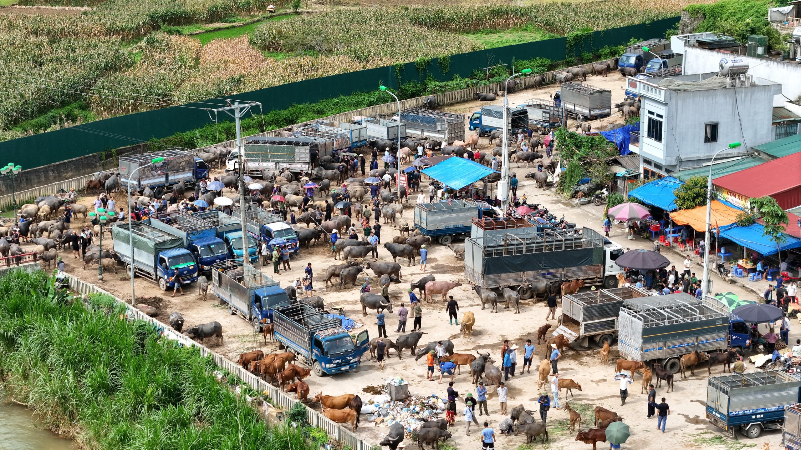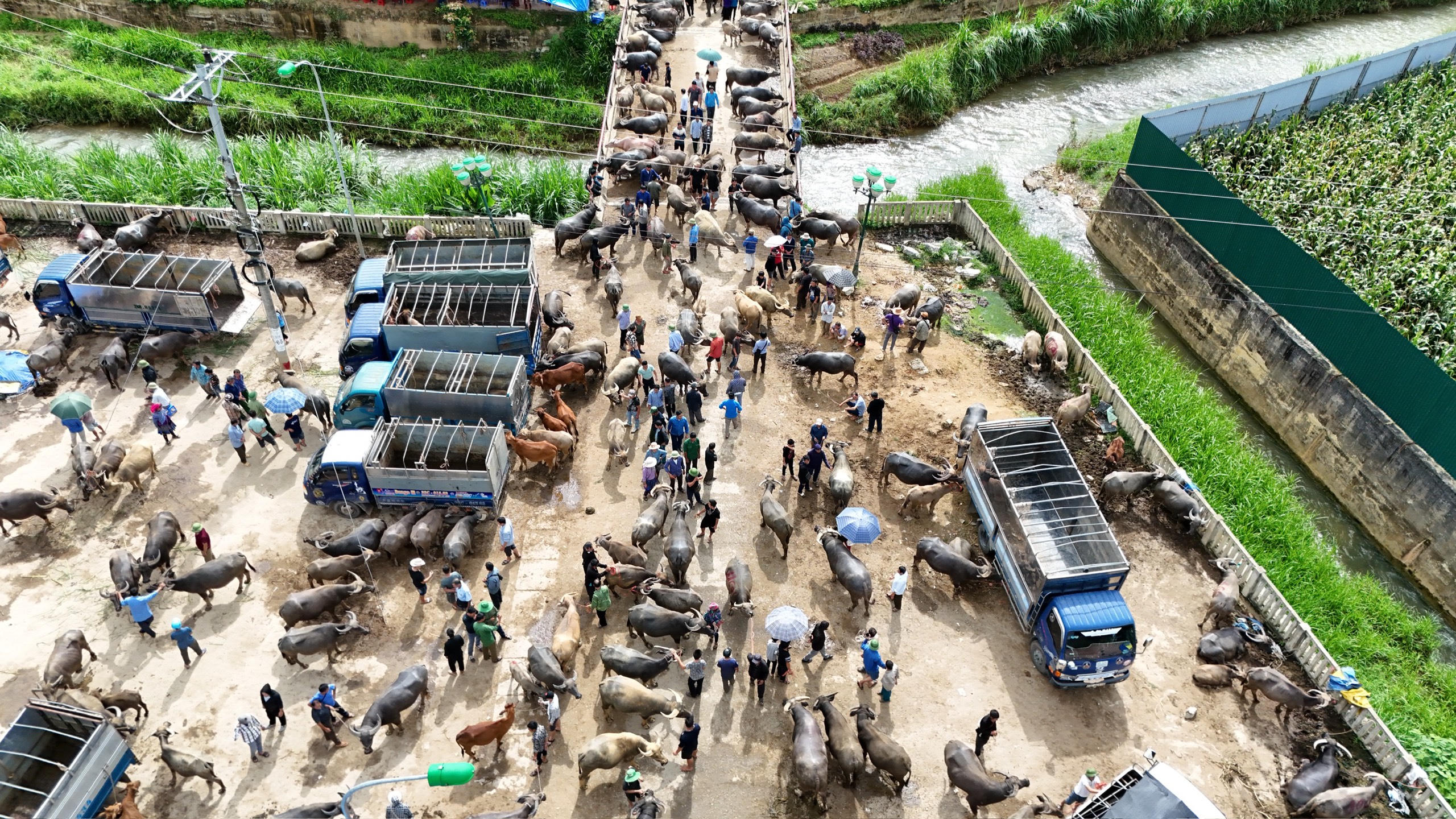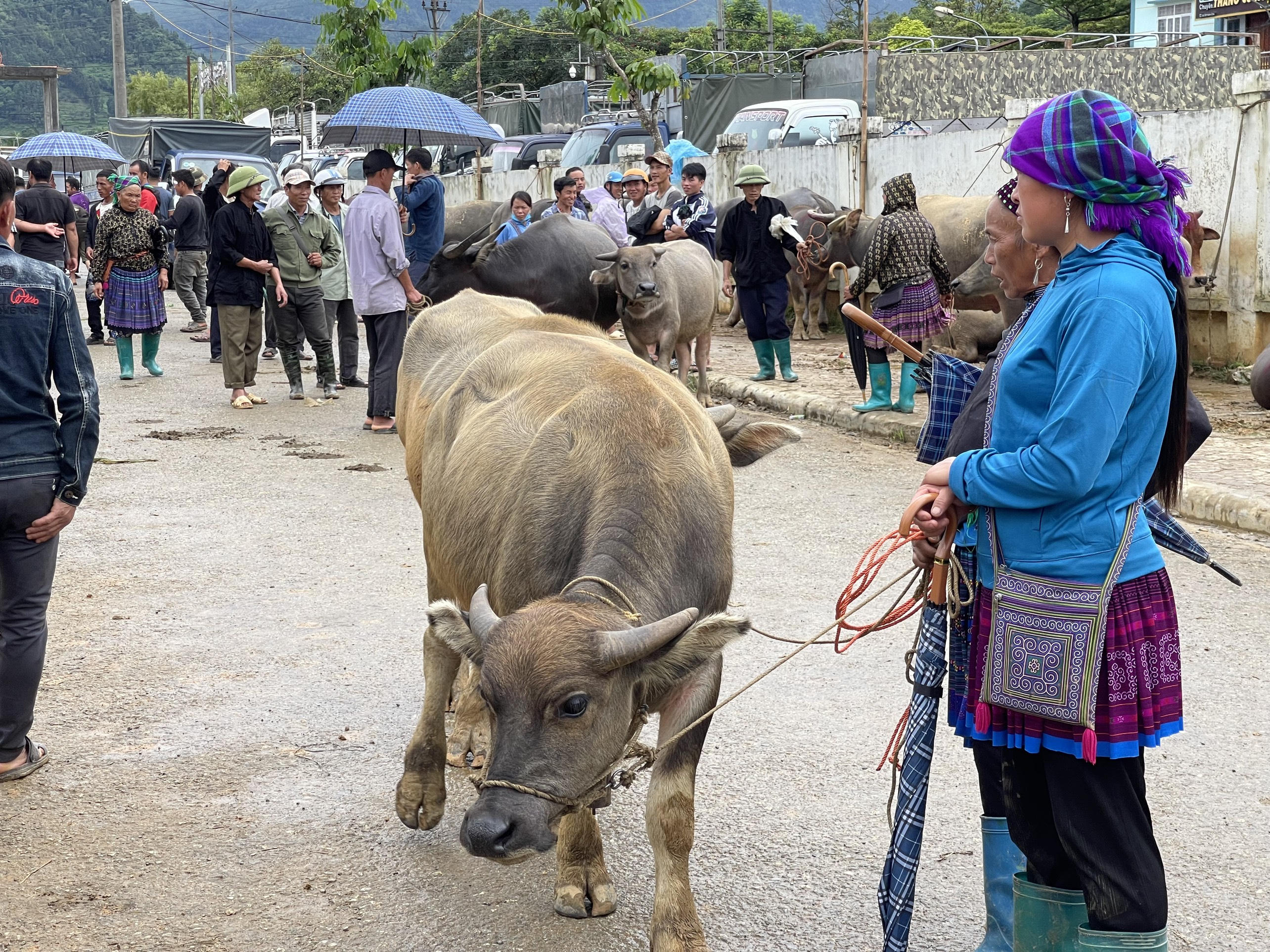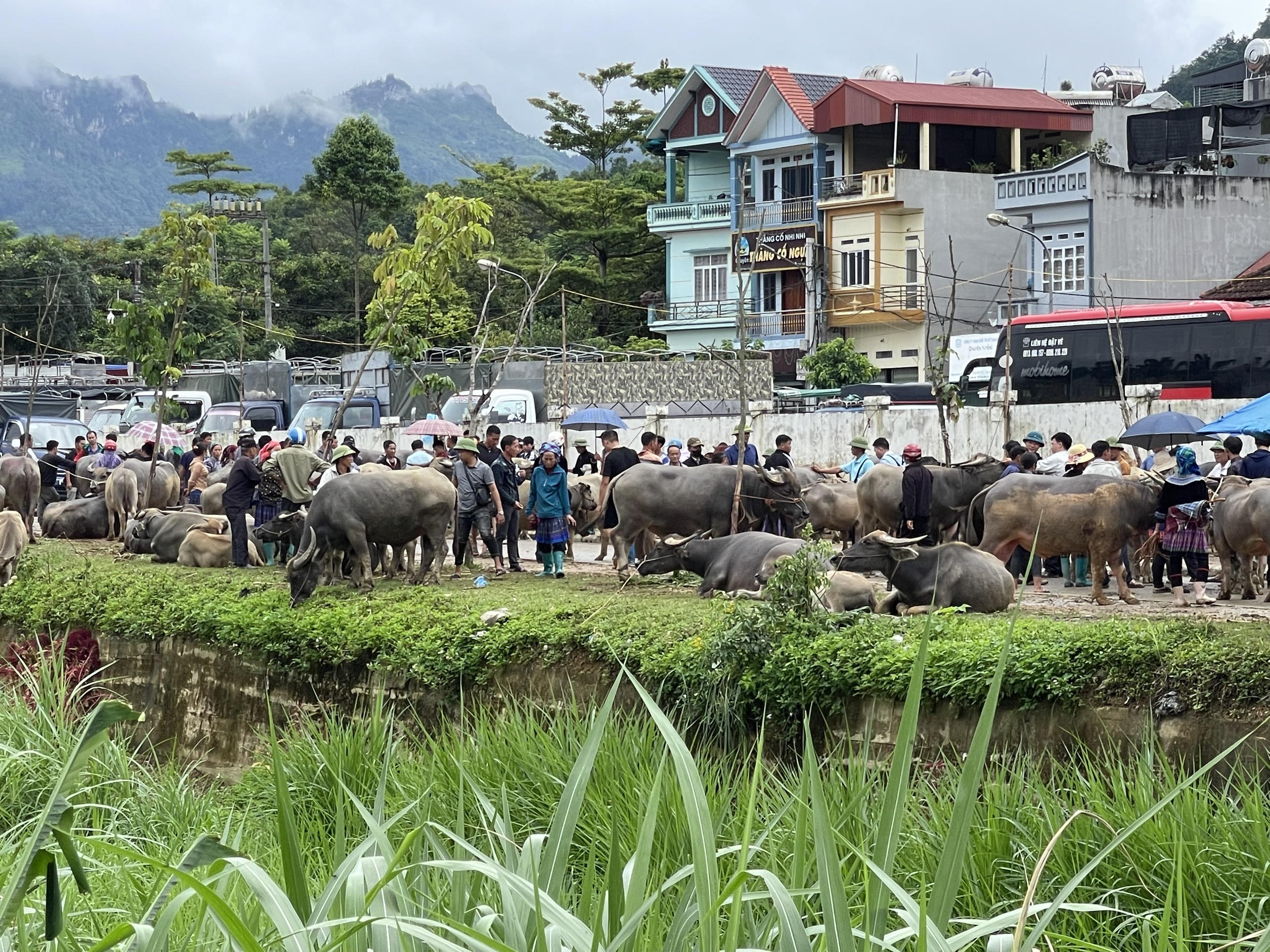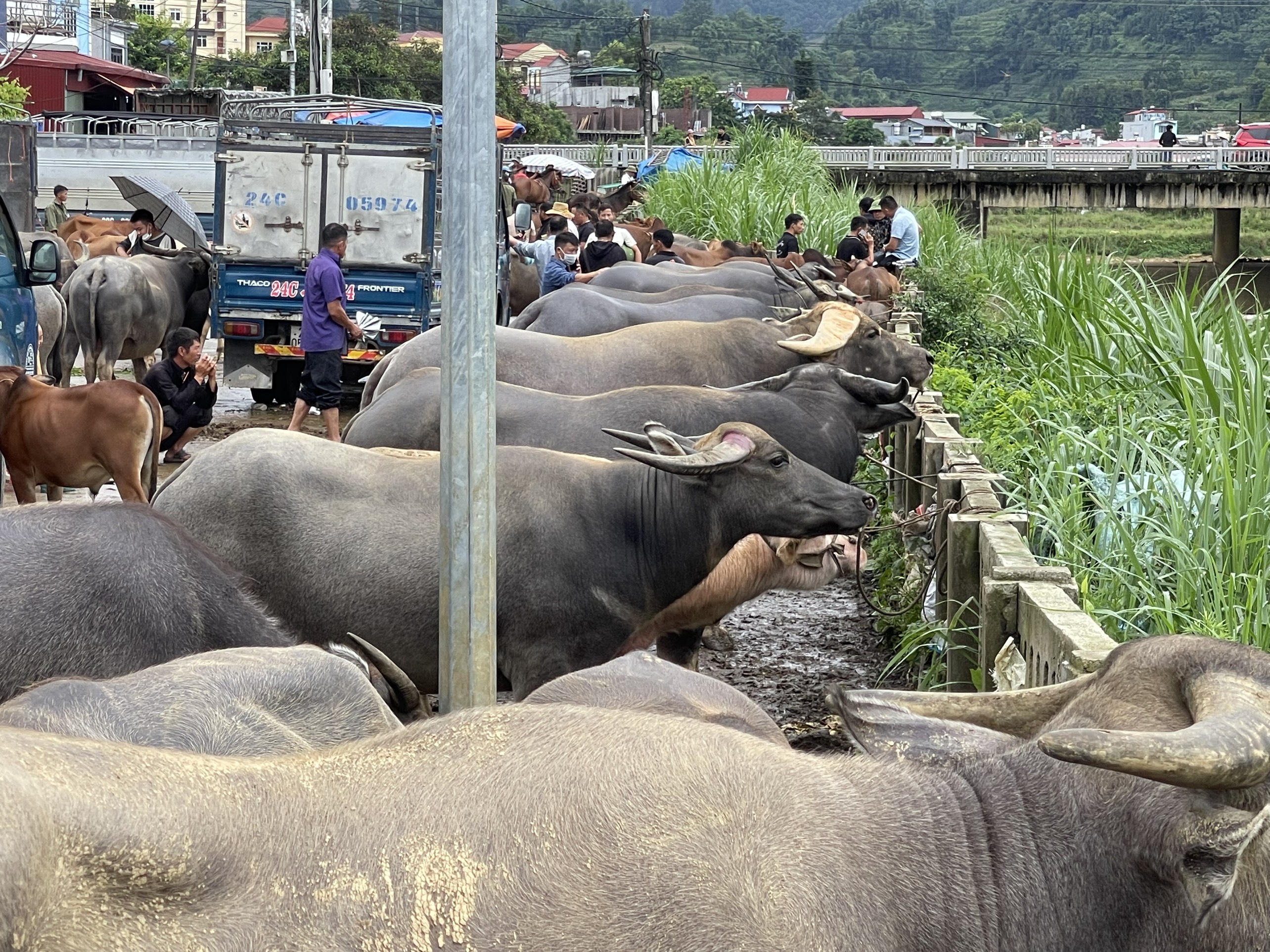 Người dắt trâu xuôi, người dắt ngược. Con thì buộc vào gốc cây, con buộc vào thành cầu… Ai nấy đều tranh thủ vừa đi bán, vừa buôn chuyện với nhau. |