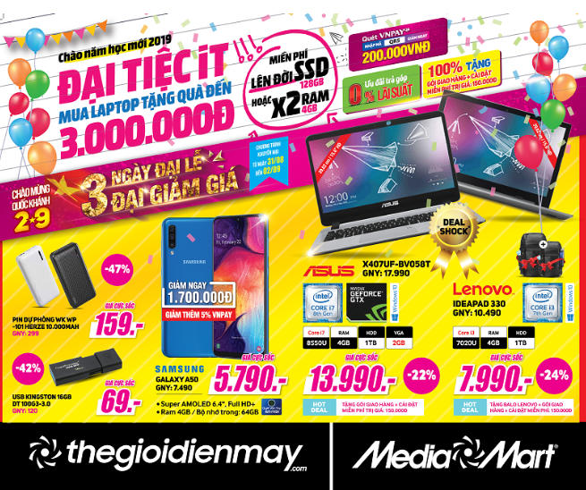 Chào năm học mới, MediaMart mang đến đại tiệc IT: Mua laptop tặng quà đến 3 triệu; Miễn phí lên đời SSD 128GB hoặc nhân 2 Ram 4GB. Một số model laptop phù hợp cho sinh viên được giảm giá sâu trong đợt này có thể kể đến: Laptop Lenovo IDP 330-(81G20079VN) - Form mới, cấu hình mới, giảm 24% giá cực sốc 7.990.000đ; Laptop ASUS X407UF-BV058T - Laptop Core i7 Đại giảm giá 22% giá cực sốc 13.990.000đ…