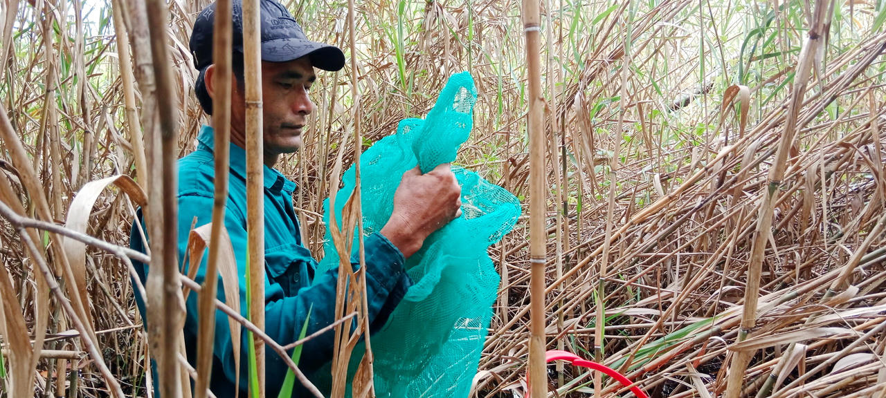 Để chuẩn bị cho chuyến “săn” mật, anh Khanh và anh Hoàng mang theo dao, bó đuốc và đội mũ lưới xuống tận cổ. Sau đó, anh Hoàng chạy xuồng máy đưa tôi len qua thảm bèo dày đặc, đi giữa ngút ngàn lau sậy bung cờ trắng xóa, tiến vào vùng xanh thăm thẳm của khu rừng tràm rộng tới 100ha, nơi có khoảng 1.000 kèo ong.