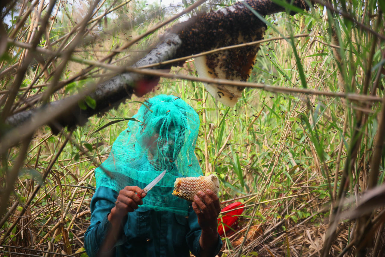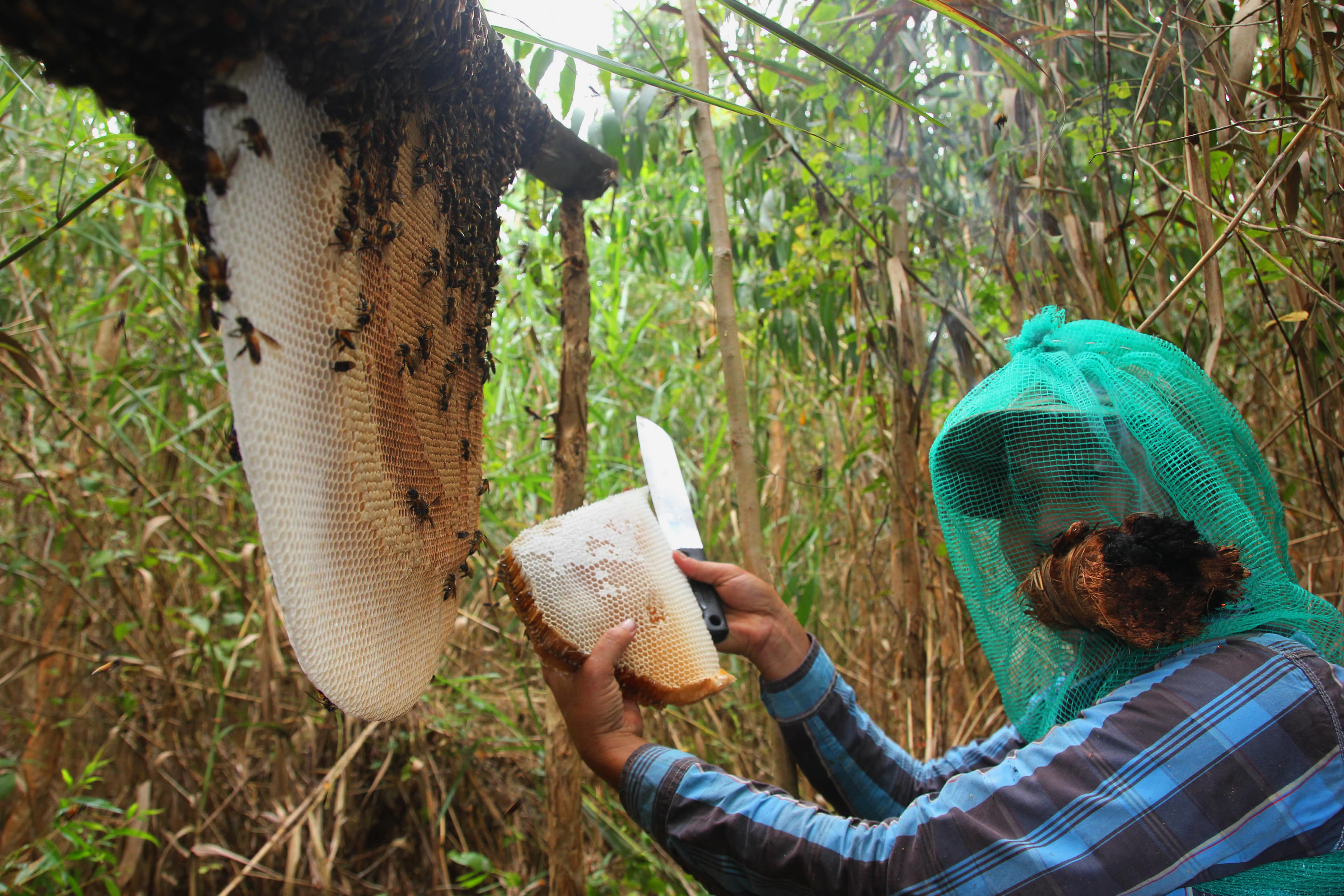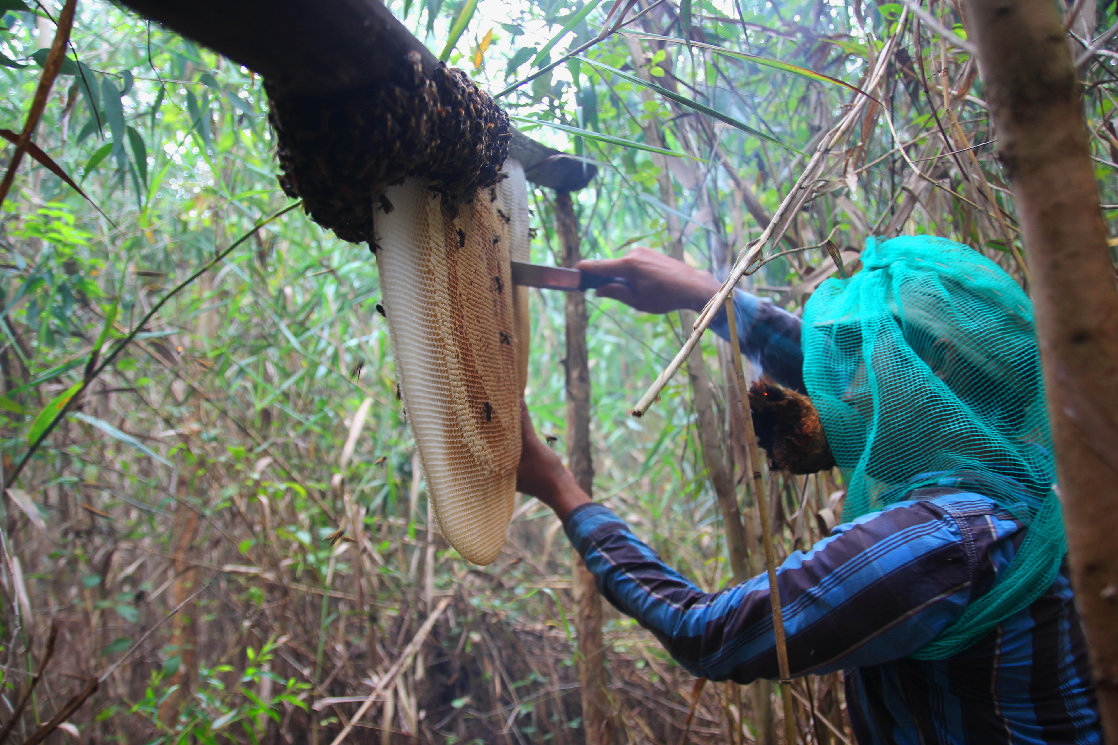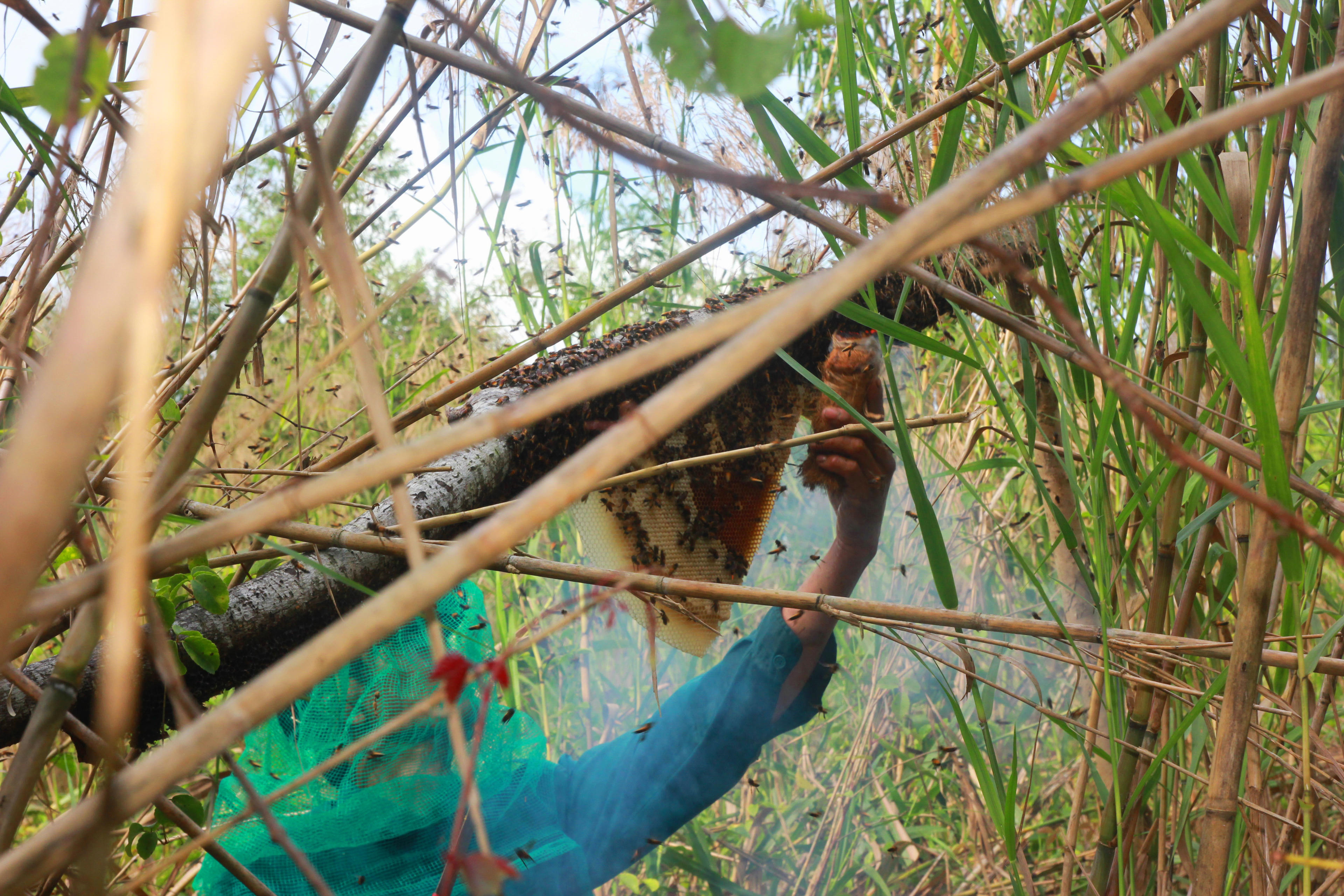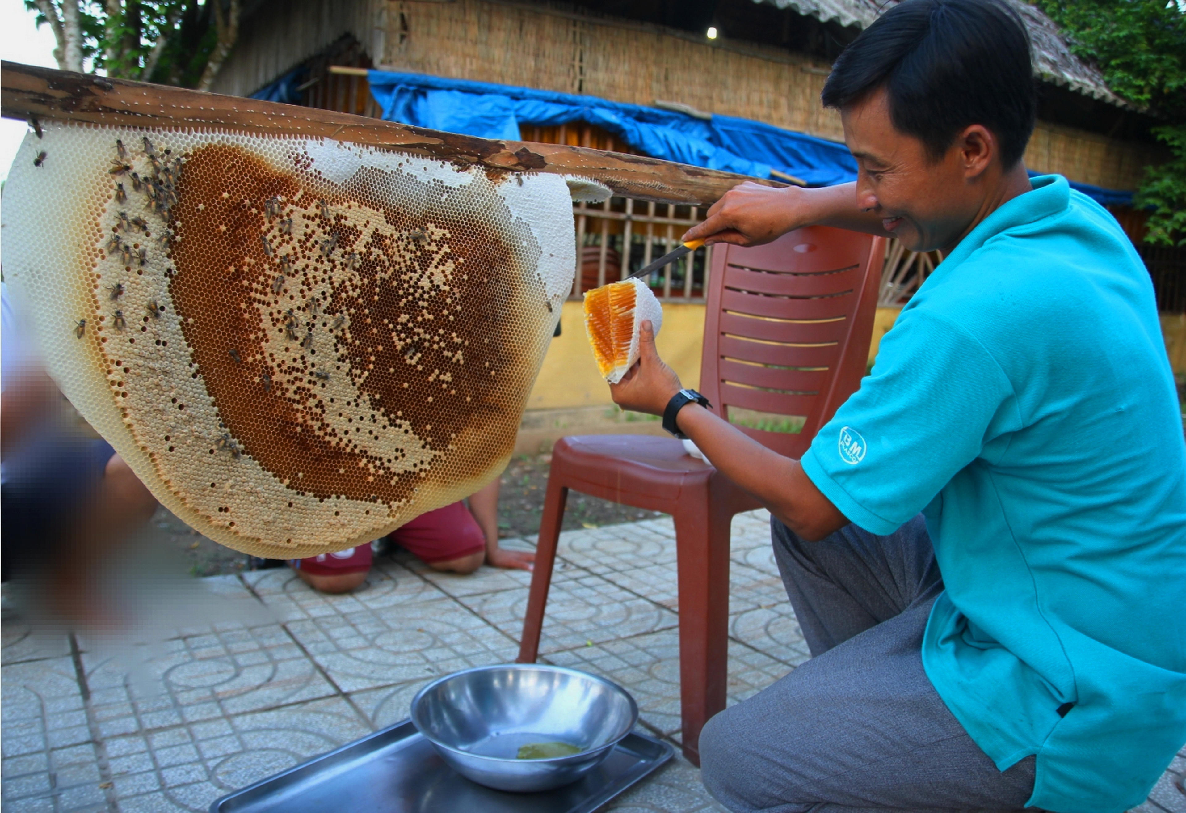 Khi đến gần tổ ong dài cả mét, anh Hoàng khẽ đưa đuốc cuốn bằng xơ dừa rồi thổi và quơ qua lại, khói toả ra nhưng không gây ngạt, vài con ong bắt đầu bay ra khỏi tổ. Vừa làm, anh vừa nói,“săn”ong đi vào sáng sớm là tốt nhất vì còn sương đọng trên lá, an toàn về phòng cháy, chữa cháy và buổi sáng ong chưa hoạt động nhiều. Chỉ mất vài phút, anh Hoàng cùng anh Khanh lấy con dao cắt từng miếng tổ ong xuống. Mật ong đặc quánh, vàng óng, toả hương thơm ngào ngạt. “Làm nghề này mà bị ong đánh là chuyện thường. Năm 15 tuổi, tôi đã theo cha đi “săn” ong và không ít lần bị ong đánh nên cũng sợ lắm…” - anh Hoàng vui vẻ kể.